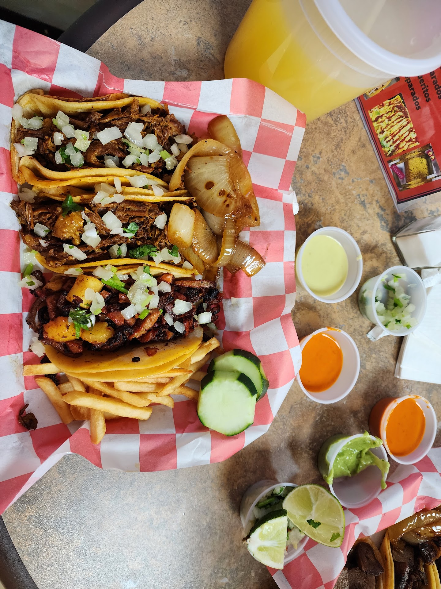Ordered birria tacos, and no au jus included. Thatās the whole point of birria. The al pastor? Should be renamed to āunseasoned pork fat.ā Suadero, which they claim is brisket, tasted like it was drowned in ketchup and deep-fried, more like something off the steam table of a cheap Chinese buffet.
