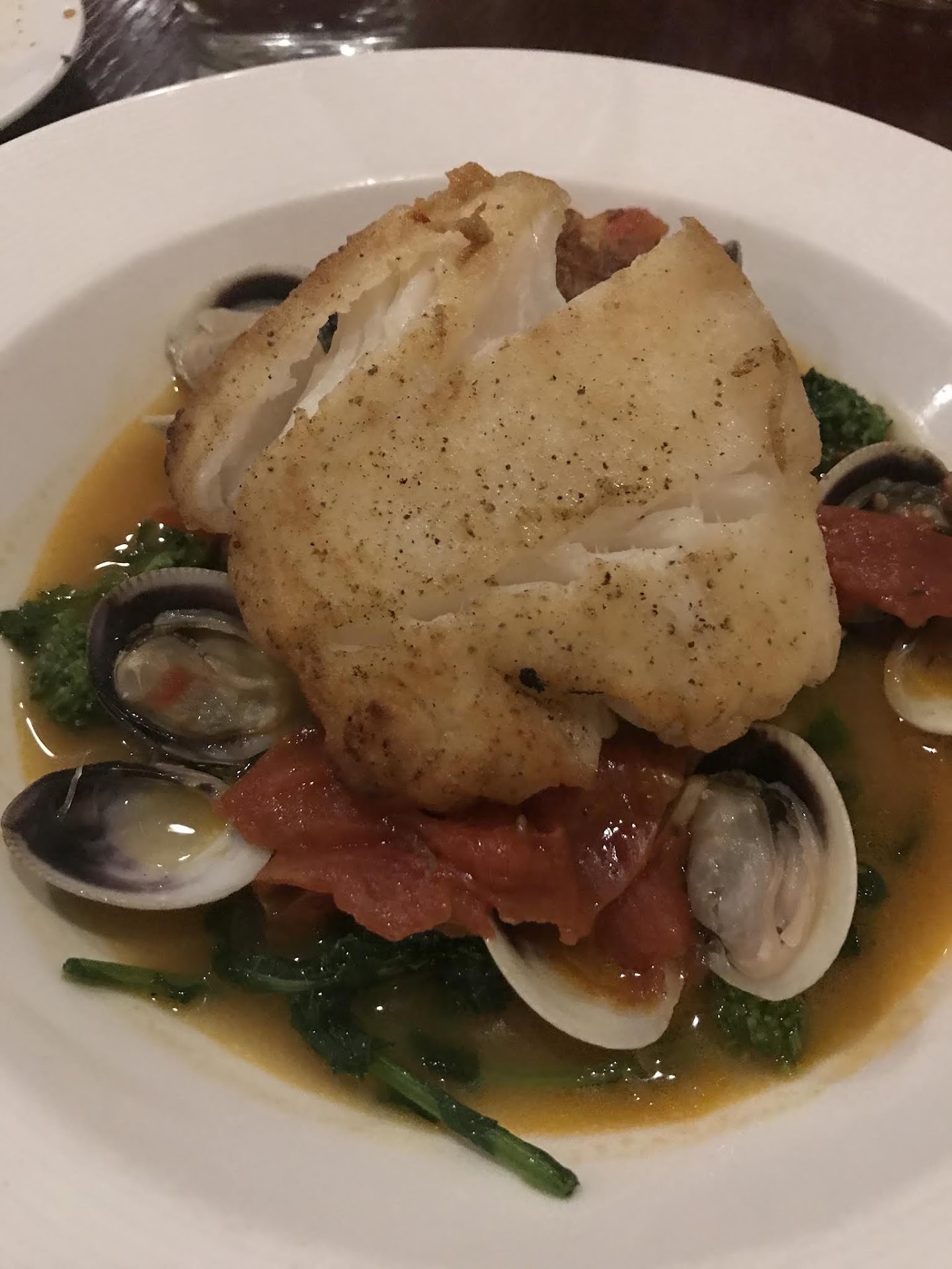 For our entries my wife and I had another wonderful creation that Steve made for us, it was a Duck breast served along with duck confit risi e bisi and in a duck jus. This was just an absolutely wonderful presentation and cooked perfectly, (not that we'd expect anything less.) One of our daughters elected to have and by the way thoroughly enjoy the Veal Chop alla Parmigiana, cooked to the perfect temperature with just the right amount of parmigiana and sauce on it. What she couldn't finish probably became her Sunday night dinner as well. Our other daughter had a beautifully prepared Roasted Cod served with baby clams and a tomato brodo, classic Steve preparation and presentation.