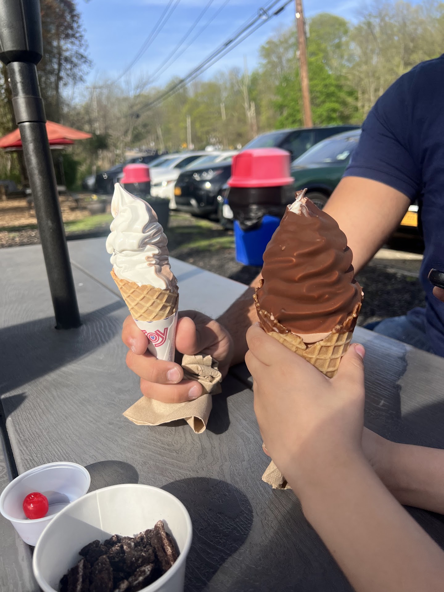 1 small cone twist 1 small cone with chocolate sprinkles 1 large cone twist dipped in fudge Oreo topping on the side $26!