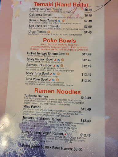 I had warm sake and a Japanese Kirin beer, my wife had hot tea and water. We had the fried calamari with their in-house tartar sauce, amazingly delicious. My shrimp ramen bowl was extremely filling. My wife had the poke bowl without rice. They substituted vegetables. Very appreciative of that by the way! The interior is very Tokyo centric. Something that you don't see in this area too often. Especially at these amazing prices! Again, ownership should be commended, the Asian pop music being played was enjoyable!