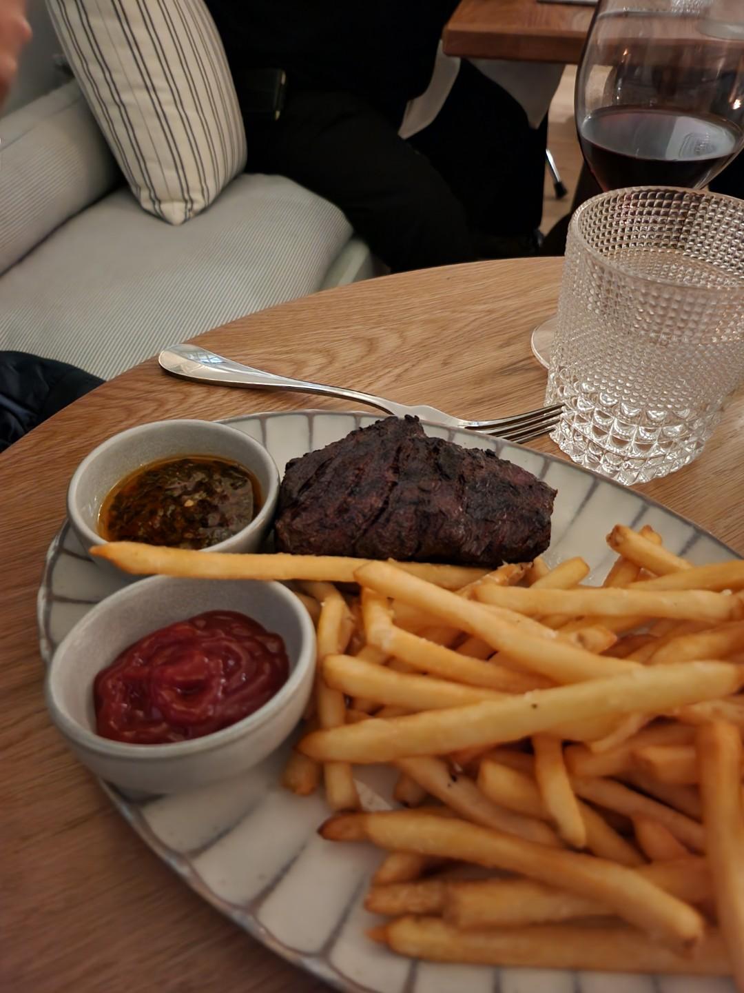 Second. the Food. It's the Hamptoms, where I find the prices to be worse the NYC. Beware, the portions are small. If ur looking for a big meal, this isn't the place. The meal was started with a drink order. The wines are over priced. The mixed coctails are more reasonable, and pretty good. Next, the table is treated with fresh made focaccia...so good!! As well as, a dramatic show of bread sticks, which weren't as good. For the meal, the crab dip (sorry no pic), delicuous! Large chunks of crab cooked and served in a cast iron skillet with bread. The black bass (skip). I'm in the camp of when the fish skin is left on it should be crispy. The olive oil pouched bass skin was wet and soggy and very unappetizing. The fish was slightly over cooked, not terrible but verging on dry. The flank steak, which i ordered medium rare, was closer to a medium. It was a good steak, again small portion. The fries were really good.