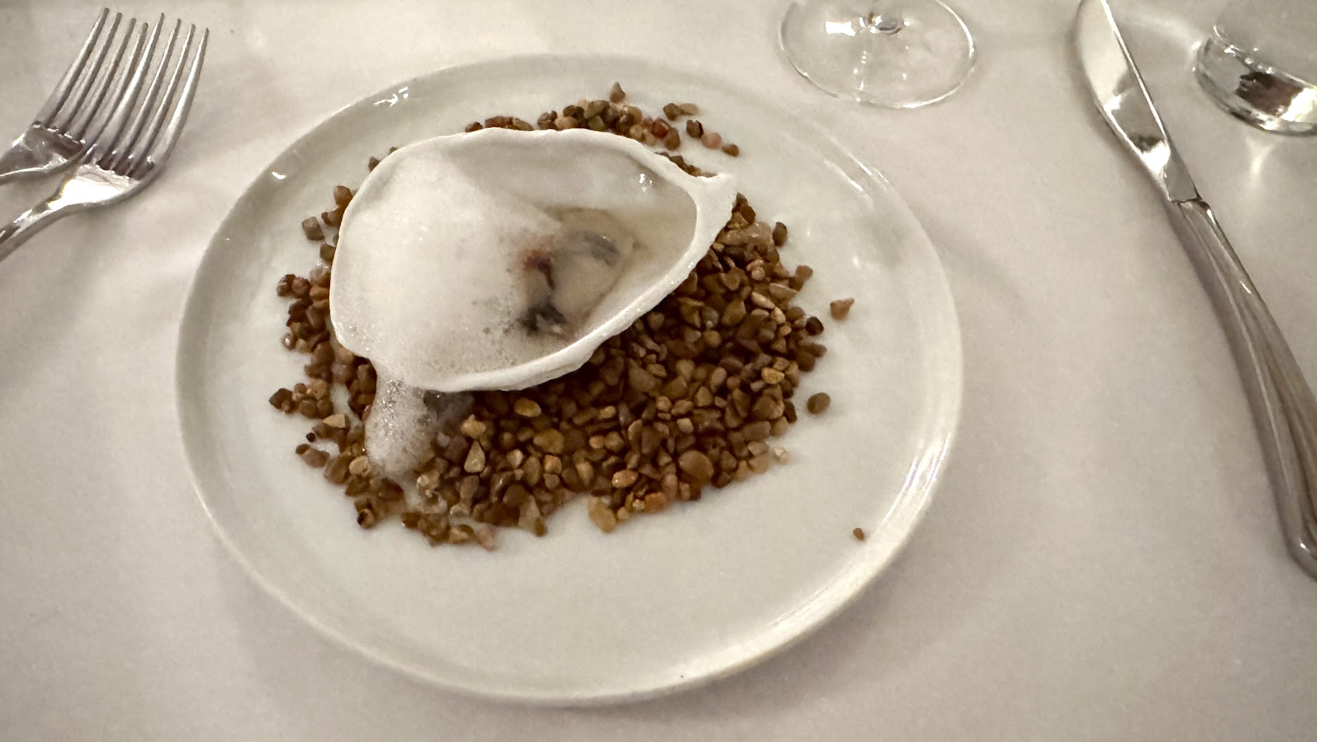 We were served with a glass of champagne and a smoked oyster on a half shell with a lemon foam. These were complimentary, on the house and designed to clean the palate and allow for a better tasting of the rest of the course.