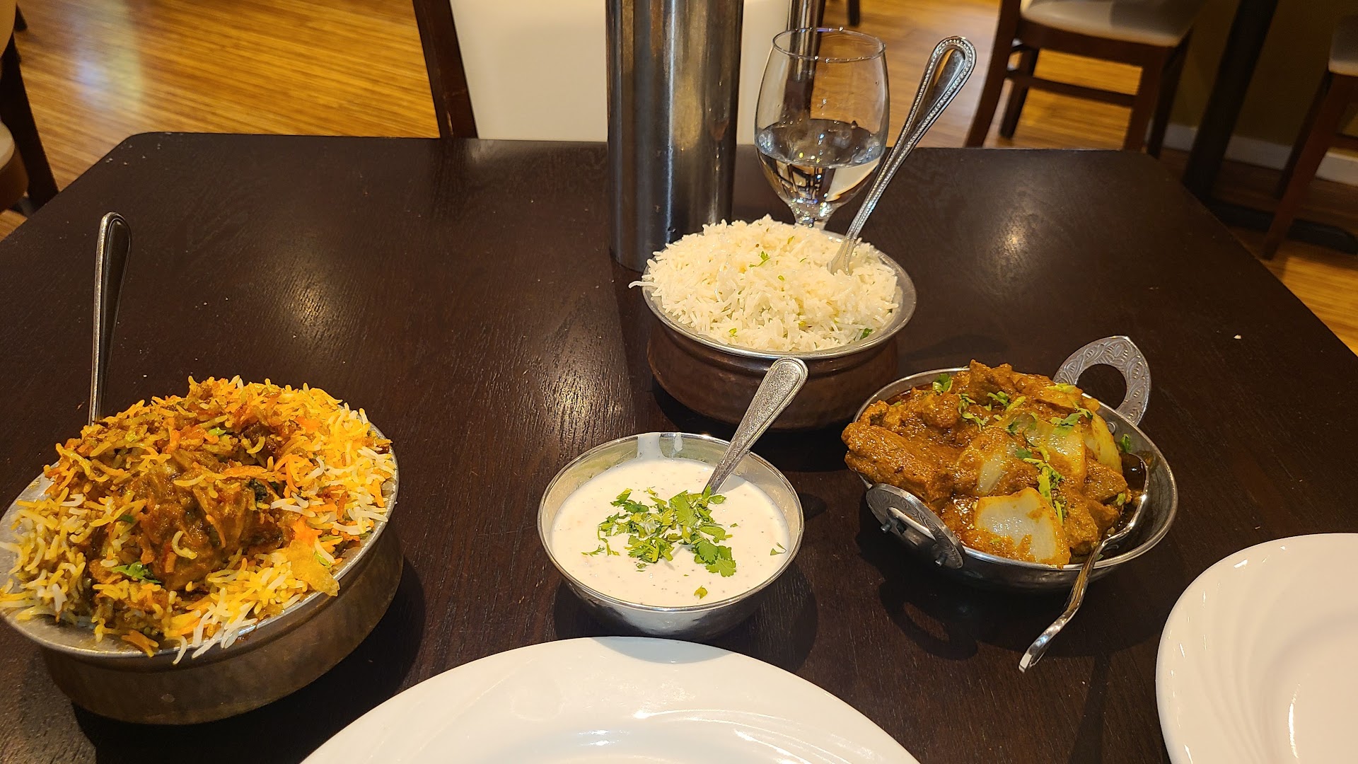 I went there for dinner once, and while the food was much more expensive during that time, it was certainly still worth going. I've never been disappointed with the quality of the food. The atmosphere is quiet and aesthetically pleasing, and they keep the Naan coming for as long as you're willing to pay for it. Oddly enough, I've never been in the bathrooms there, but I imagine they are clean and well-stocked.