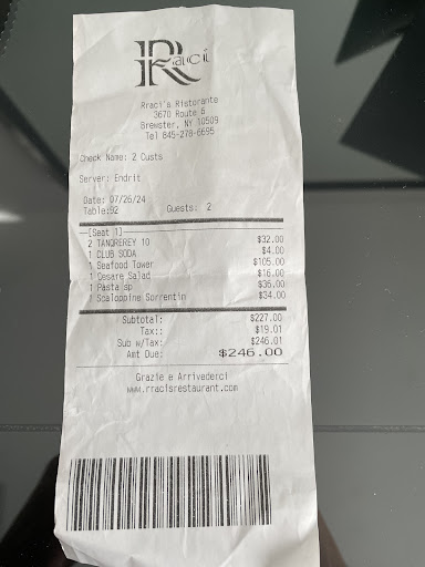 Read moreMy boyfriend and I were eagerly looking forward to our dinner at Rraciâs to celebrate my birthday as we had both been there before separately and enjoyed it. It will be the last time we visit as the meal and service were not commensurate with the price of the bill. We had a table outside for a 5pm reservation on Friday night and were the first table to be sat. I donât drink, so I ordered a club soda with lime while my boyfriend ordered gin and tonics which he found to be very weak. Since this was a celebration, we decided to order the seafood tower for 2 at market price. It included 1 lobster, 6 oysters and 4 shrimp cocktail. It was fine, but nothing stellar. We then split a Caesar salad, and I ordered the lobster and crab ravioli special, and he ordered the veal Sorrentino. The filling in my pasta tasted as if it came out of a can, and the pasta was more of a deflated dumpling than a ravioli, but the sauce was good. The green beans on my boyfriendâs plate were clearly frozen (this is coming from people who eat fresh, sauteed green beans on a weekly basis, so we know the difference). The real insult aside from the overpriced, sub-par food was that our table service completely stopped. Even if we wanted to return the dishes, no one came by after they were dropped to check on everything. A busboy came by nearly halfway into the meal to ask if I wanted parmesan and pepper for my pasta. Not one water glass was filled, we werenât asked if weâd like another beverage, and we certainly werenât asked if we wanted dessert (which we initially intended to have, but I wouldnât give them the satisfaction of adding any more money to the bill- we went to Carvel). They literally stripped the table, and after about 15 minutes of waiting for someone to show us the dessert menu, we asked for the check and left. Our waiter never showed up to our table again once the dinner plates came out. As someone who ordered a second entrĂ©e to take home the last time I was there because the food was so good, I was highly disappointed in Rraciâs and wonât be returning. I am including a copy of the receipt in hopes this review can make its way back to the smug waiter who couldnât be bothered with us once he had other tables to tend to. As a former server myself, this is simply unacceptable for the price of the meal we had. We were expecting to pay more for a nice meal and great service, but that isnât what we received and we feel ripped off. The next time we go out for dinner, we are taking our business to other local establishments where there is value in the food and service without...