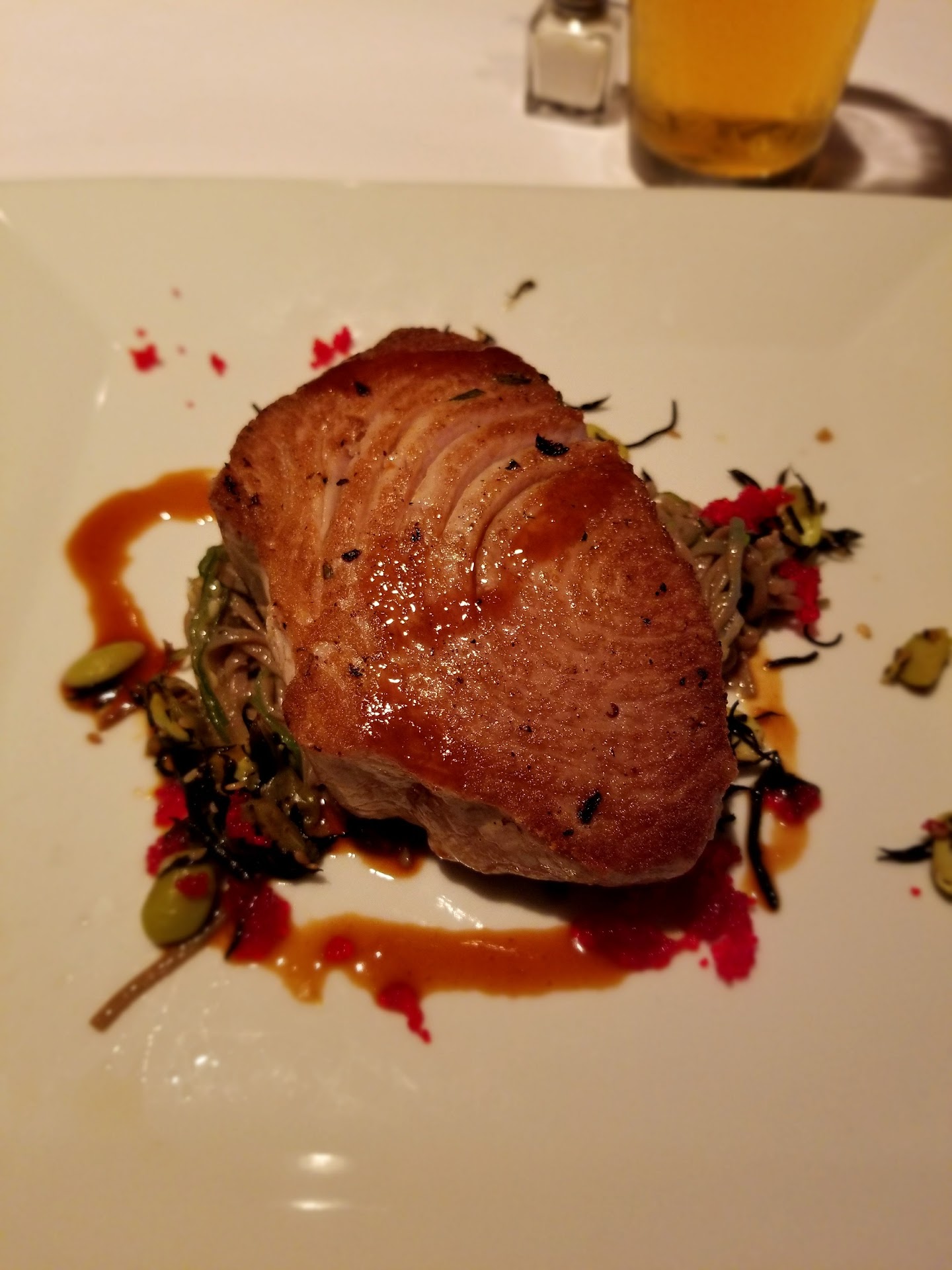 Read moreEfficient and good food, except for the dessert. The unlisted special appetizer was a grilled octopus on greens. It was superb. Moist, soft, and complex. The dressing was just right, meaning, minimal. Very impressed. The seared tuna was so-so. Clearly nothing special about the cut of tuba. Although, it was sushi grade, it lacked in flavor. The Japanese shoyu dressing was flavorful enough and as were its sauces and garnishes. The fish in itself was mediocre. The waiter, Jeff, was excellent. Attentive, professional and patient. The server, on the other hand needs to be retrained. He placed one main on top of someone's napkinwhile that person was un the restroom. Thereby, having the plate un an off kilter resting position. That turned me off. Another observation was when the server cleared the plates and cutlery from the appetizers, they did not replace my fork. Therefore, when the main arrived, I had to ask for a fork. That was annoying. These small things make a difference. Also, the PEI mussels were delicious. Too bad the server removed the plate without asking as we were dipping bread into the sauce. Yes, the mussels were devoured, but the sauce was still being worked on. The dessert, which was a key lime pie was probably not made with actual key lime. If it was, then the next criticism would be that the custard base used un the pie was terrible. Clearly, this dessert was not fresh and just really below par. It's as if they gave up on the last leg of the meal. Dessert should be equally fresh as the mains and appetizers. After all, it is the last impression you give to your departing guests. Notwithstanding, I would return. I just won't...