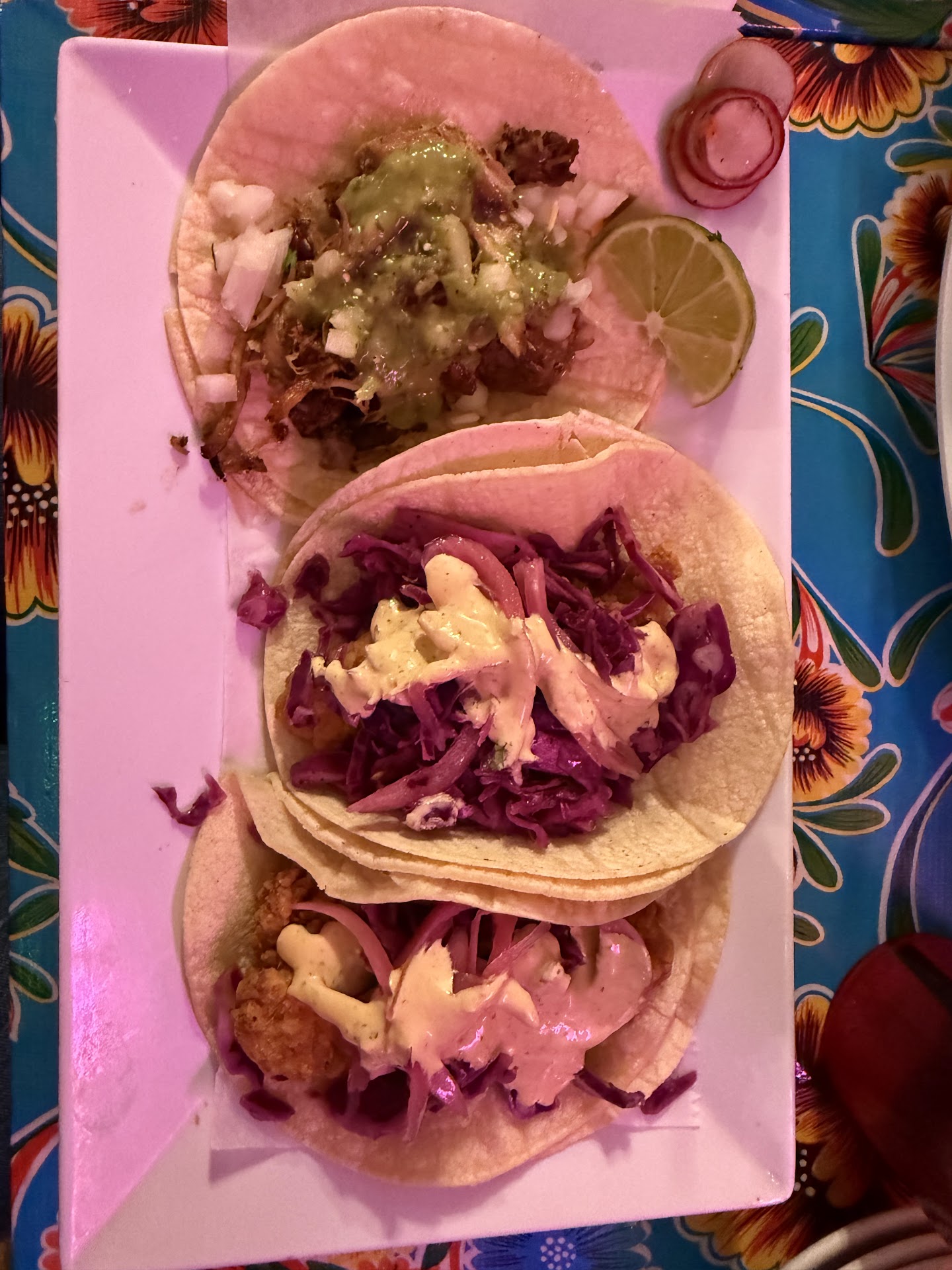 We order margaritas which were delicious. The right amount of sweet but tartness. I also appreciated them asking what kind of rim we wanted as I think salt rims should be discontinued. We then ordered the elote corn. If elote is on the menu, I’m getting it. This one was AMAZING. Probably the best I’ve ever had. Instead of regular mayo, the used chipotle menu which gave it a flavor profile that I will crave from now on. The chips were subpar. They didn’t seem fresh and weren’t salted to my liking. For my main meal I order 3 tacos: 2 Baja chicken and a traditional carnitas. You are probably wondering what is Baja chicken well instead of the fish on the Baja fish taco I substituted chicken and my GOSH. Give me 14 of them right now. The cabbage, pickled red onion, and chipotle mayo were perfect accoutrements to the crispy chicken. The carnitas taco was classic and did the job. The food was great!!!