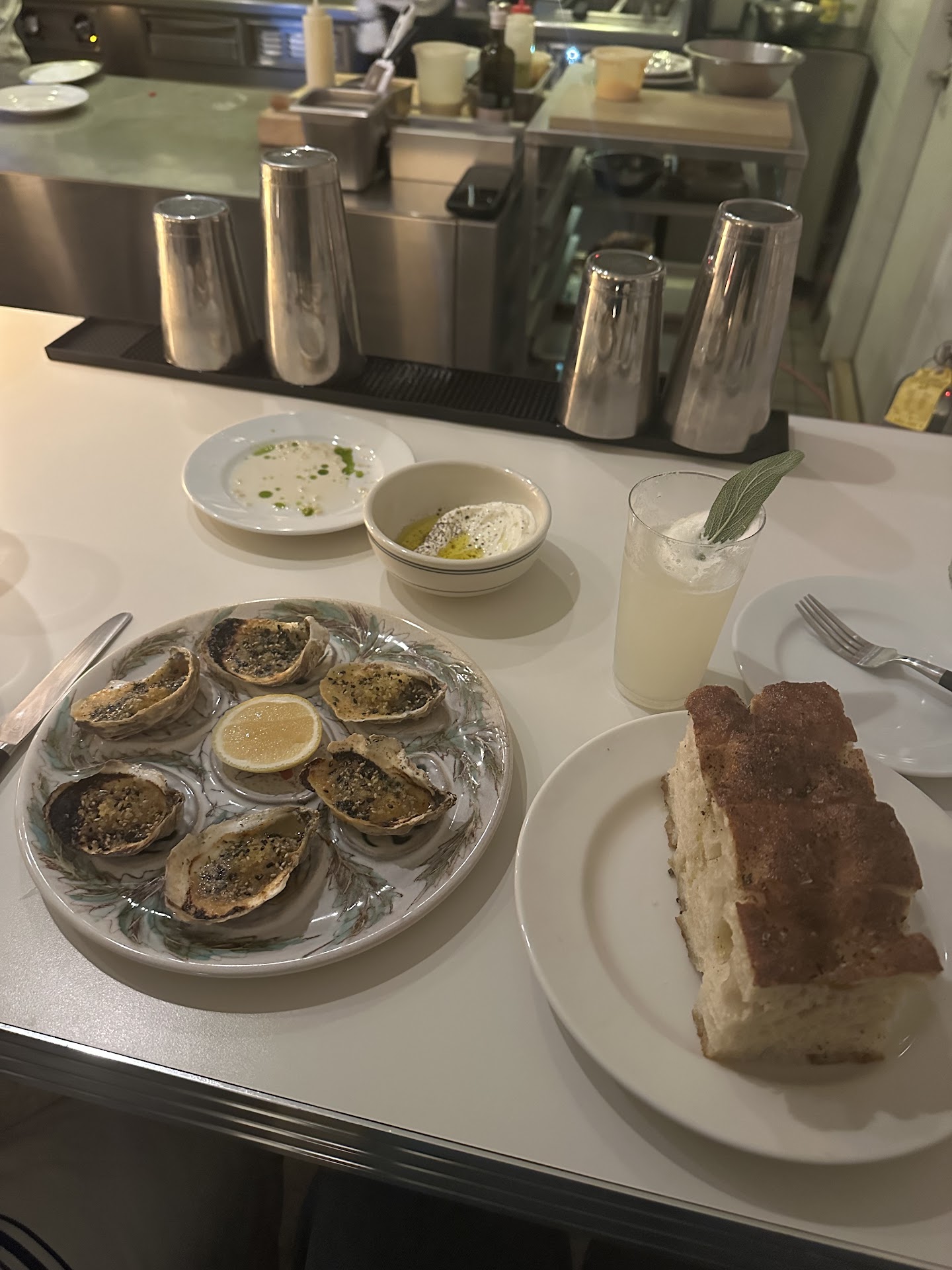 To start, we had focaccia a la nookies and the special, boiled oysters. The oysters ended up being my absolute favorite dish of the night. They are farmed right from the private beach on the property. The staff was also kind enough to give us a sample of the little neck clam salad, also delicious. Careful - this one was spicy with the long hots! We also had the koginut squash, the crispy chicken, and the chocolate mousse special and all were simply fantastic. I had never had koginut squash before and the way it is prepared is outstanding - brown butter with vincotto (a mild vinegar) with some toasted pistachios and OMG. Don’t sleep on this!!! So unique and haven’t stopped thinking about it for days. The drinks were also on point. We had a white sage gin fizz and a Manhattan, both expertly crafted.