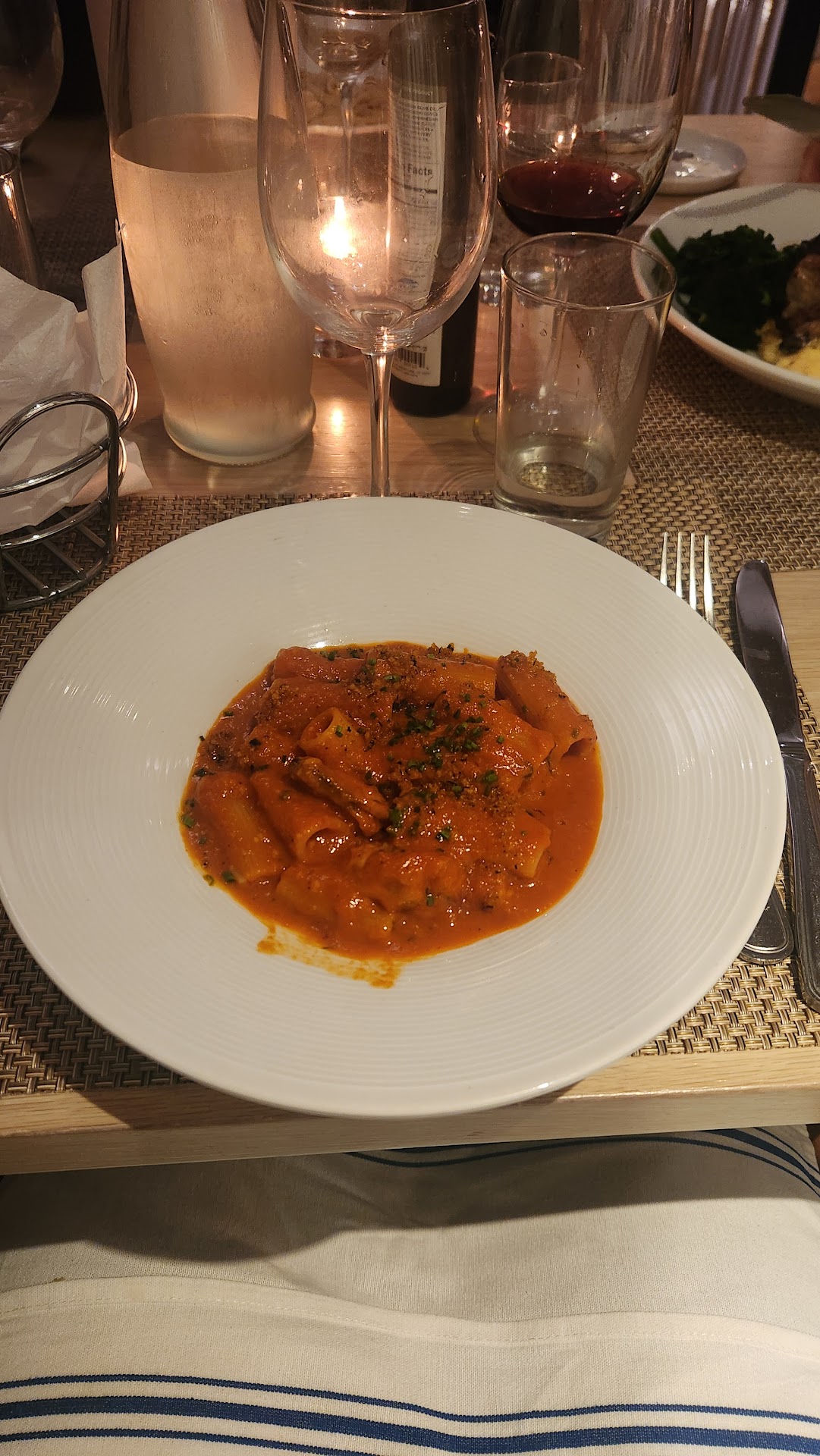 We ate upstairs. The décor was simple and the area was quiet, except for the the occasional whir of the hand dryer in the restroom, which provided more laughs from my parents than annoyance. The service was good, much improved since our first visit, save for a couple glasses that got picked up not QUITE before they were empty. As for food, we ordered a range of things: the Caesar salad, beet salad, cacio e pepe, rigatoni alla vodka with muscles, grilled salmon and the pork chop. Consensus was that the salads were nice, pastas OK, but the mains were lacking. My dish, the Rigatoni was maybe the best vodka sauce I've ever head (and I eat a lot of pasta), but the muscles in the dish were enormous and fishy--I picked around them. The Cacio e Pepe was good, but not a classic or imperfect preparation--slightly oily/salty. The salmon was a basic grilled preparation on a bed of something (can't remember what), which provided all the flavor--but the flavor was very one-note: sweet. I didnt try the pork chop, by my dad was disappointed and determined he would not order pork chops at restaurants anymore.