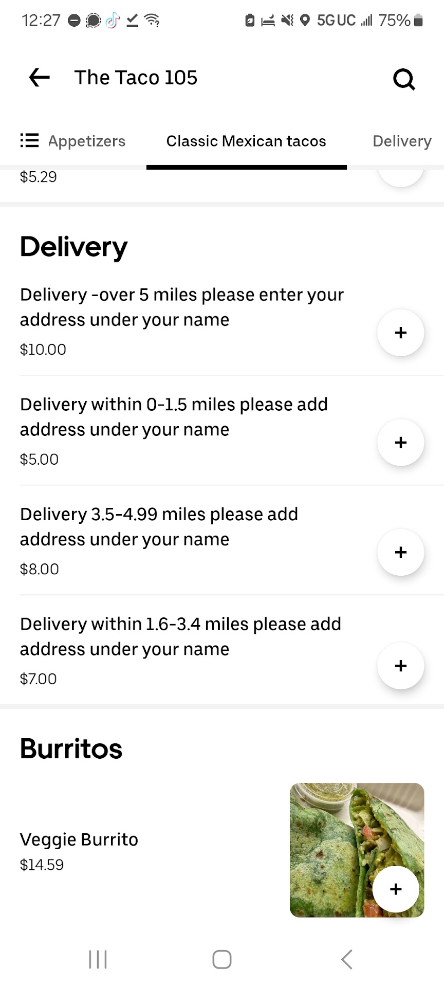 So, as an example I added one taco to my order, then the bogus delivery fee ($10 as I'm 7 miles away), proceeded to checkout, Uber added taxes and the actual delivery fee, and without Uber one the total would have come to $36, for a single taco, without tip.