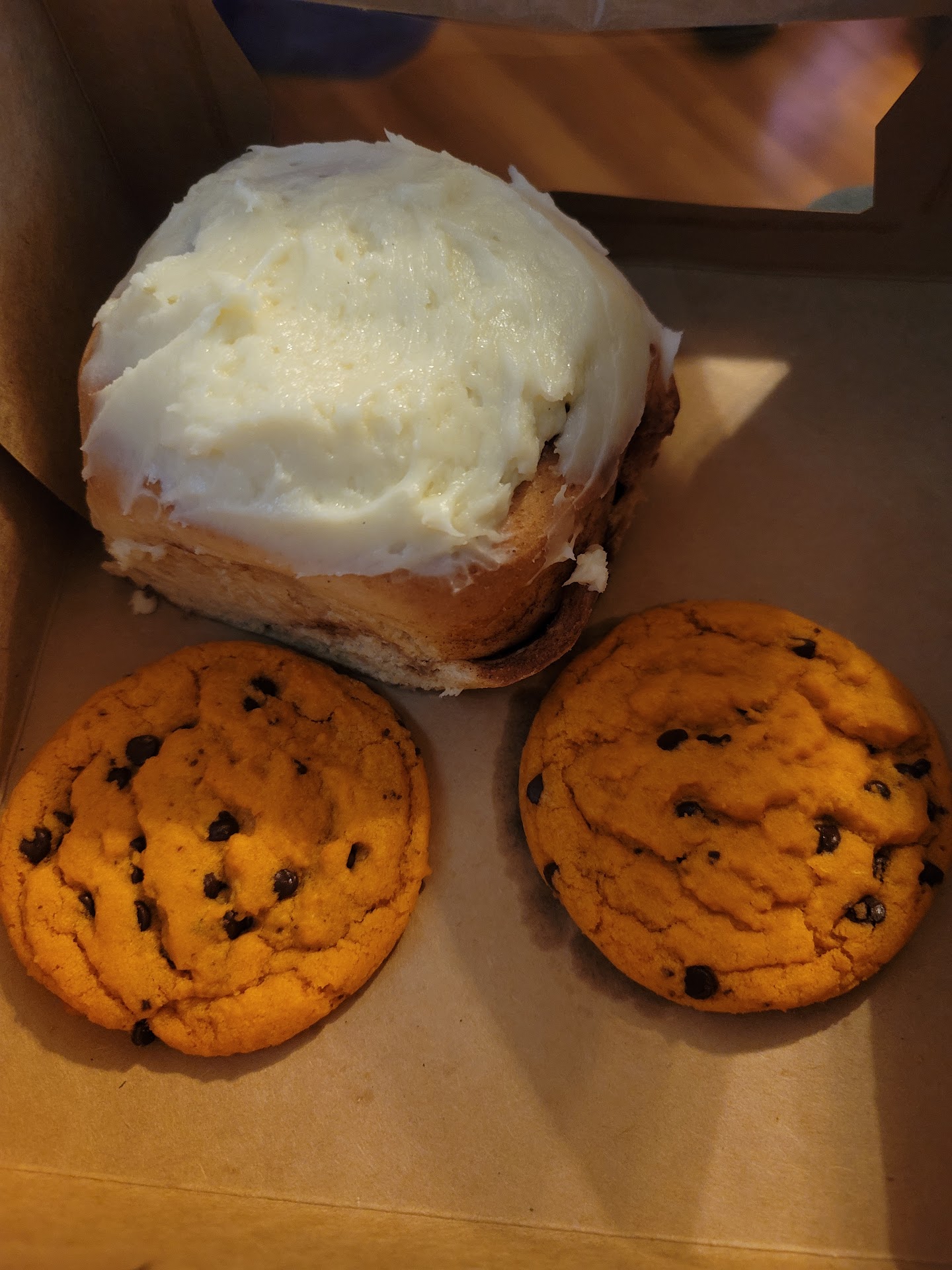 Read moreLet's start with the positives. It is a nice little shop with nice people. Everything presents well. I purchased a chocolate chip cookie, a sandwich cookie, a peach pie bar, a brownie and a cinnamon roll. Total cost $20.59. I have had a worse chocolate chip cookie I just can't remember when. It had no flavor and wasn't baked enough. The sandwich cookie was the same, bland and not baked long enough. The filling tasted like sweetened shortening. The peach pie bar was also disappointing, again very bland. The bottom crust was good and the sliced peach added some much needed flavor. The brownie was a better option. Very fudgy and tasty! The cinnamon roll, although good, did not live up to the rave reviews I'm seeing here. It would have been better without the icing. The icing again was flavorless and there was far too much of it. In all honesty you can get better cookies and frosting from the Wal-Mart bakery. The great reviews I'm seeing here certainly didn't reflect what I...
