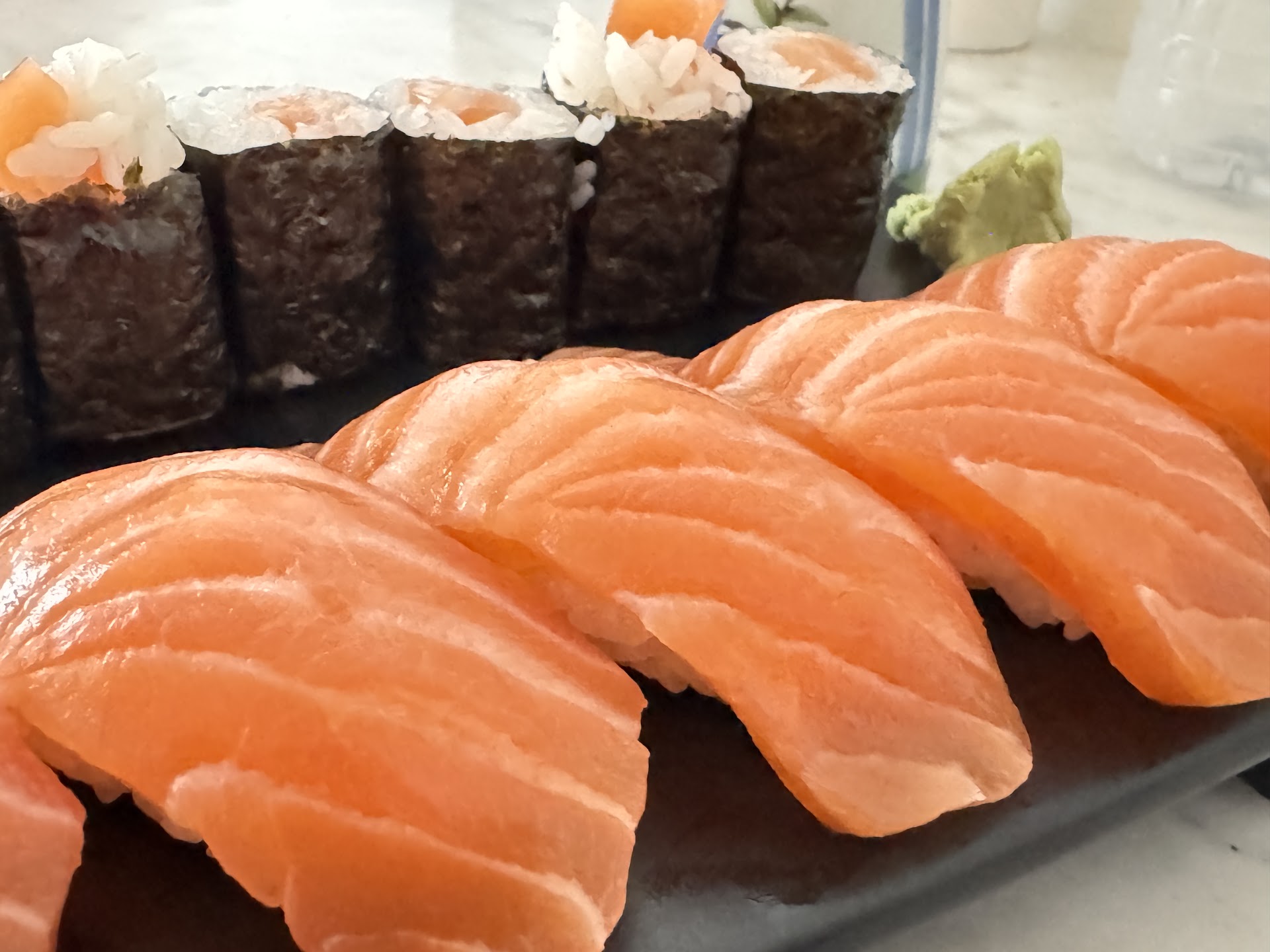 I began my meal with the Salmon Set, which included one salmon roll and five pieces of salmon nigiri. The nigiri featured thick slices of salmon that were both rich and tender, melting in my mouth with each bite.
