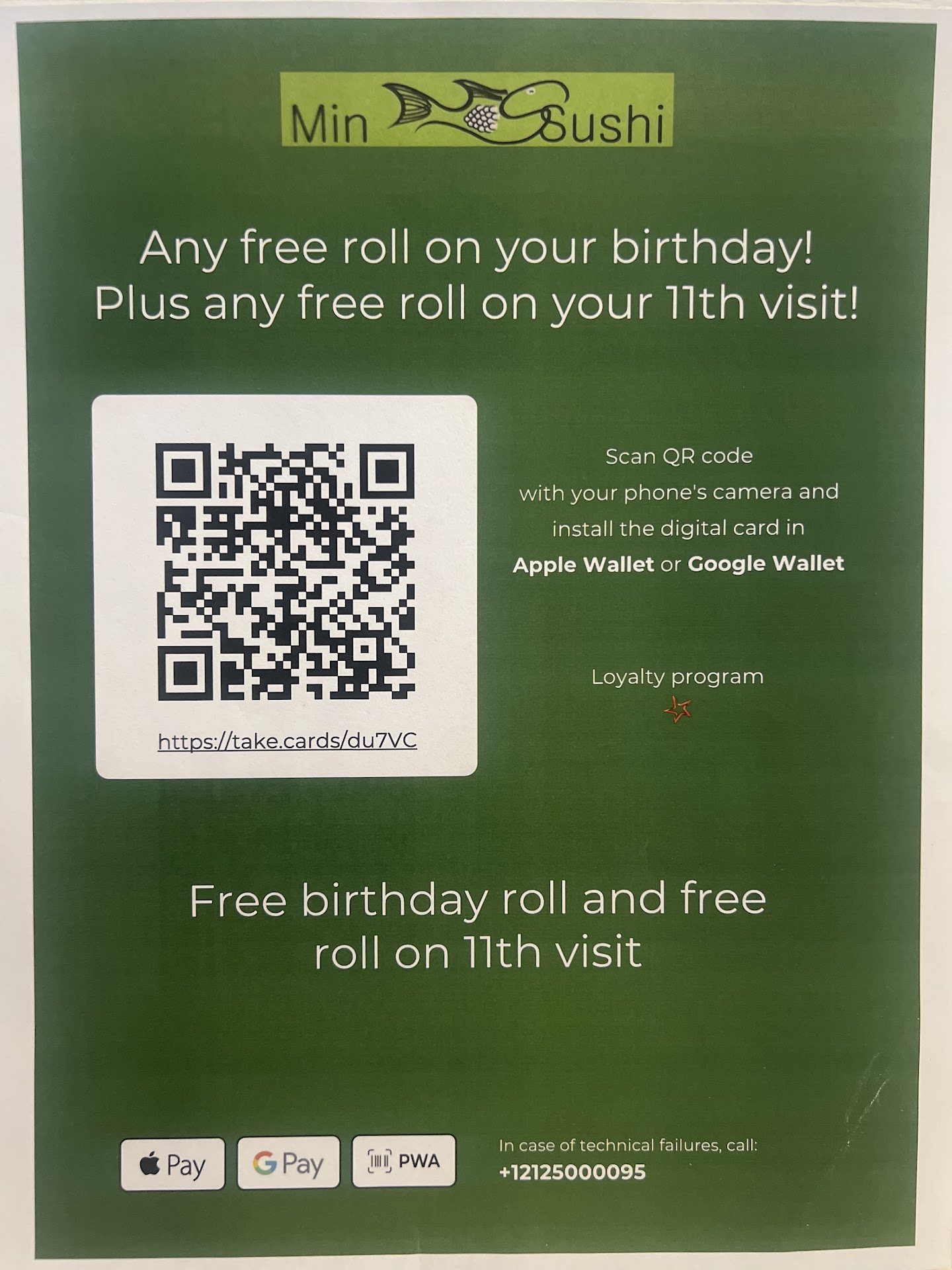 Read moreMin’s Sushi has truly elevated the dining experience with their exceptional loyalty program and discount services whether dining in or taking out. As a regular, I appreciate the seamless way they track visits using your Apple Wallet or Google Wallet. Simply scan the barcode after each purchase, and there's no need to keep track of a physical loyalty card.