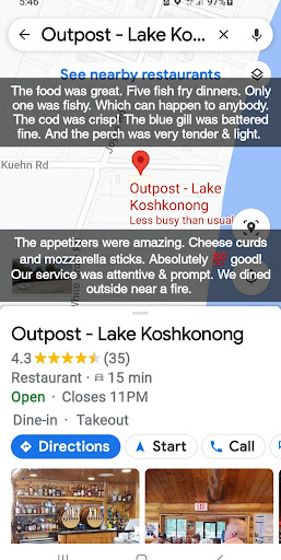 Read moreI went for the first time because my Oldest Son was one of the line cooks tonight & it was Friday Fish Fry. I brought the whole Family. We had great service. We came while it was somewhat early. Started inside but it is to loud for conversations, so we moved outside. The place is nice. Servers are absolutely attentive & wonderful. We had five fish fry dinners. One cod, one perch & three blue gill. Of five fish dinners only one was slightly fishy. Which if you have cooked at home. Fresh fish or frozen fish, it can happen to anyone. Everyone was really happy, had a great time and will definitely pop in again. Their appetizers are perfect. If you want a nice sit by the fire and chat with friends. Their outdoor dining, appetizers and drinks would be the perfect calm evening. The place was busy, yet calm. You need to try the cheese curds & mozzarella sticks if you eat that type of food. They had that...