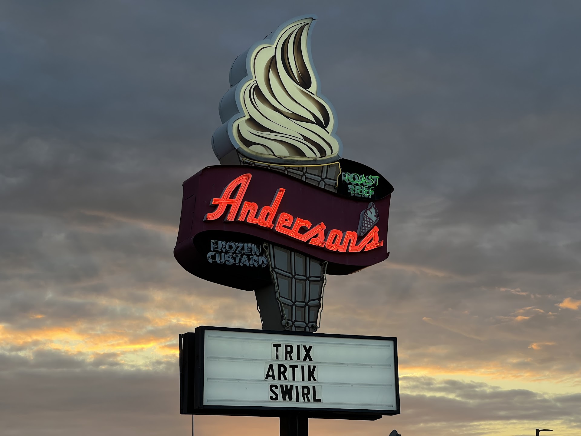 Ā Ā Ā Read moreWe love Anderson's frozen custard, and the food's good too. This location really has that feel of the drive-in ice cream place from summers long past (but the enclosures that go up in the fall make it so you can enjoy it year-round!). The staff is generally really good with custom orders, so you can get your favorite mix of flavors, whether it's a sundae, cone, or shake (or malted). With a mix of frozen custard flavors, Italian ice, and hard ice creams and frozen yogurts there are lots of possibilities available. And of course, there are frozen ice cream cakes and pints/quarts already packaged for take-home options.