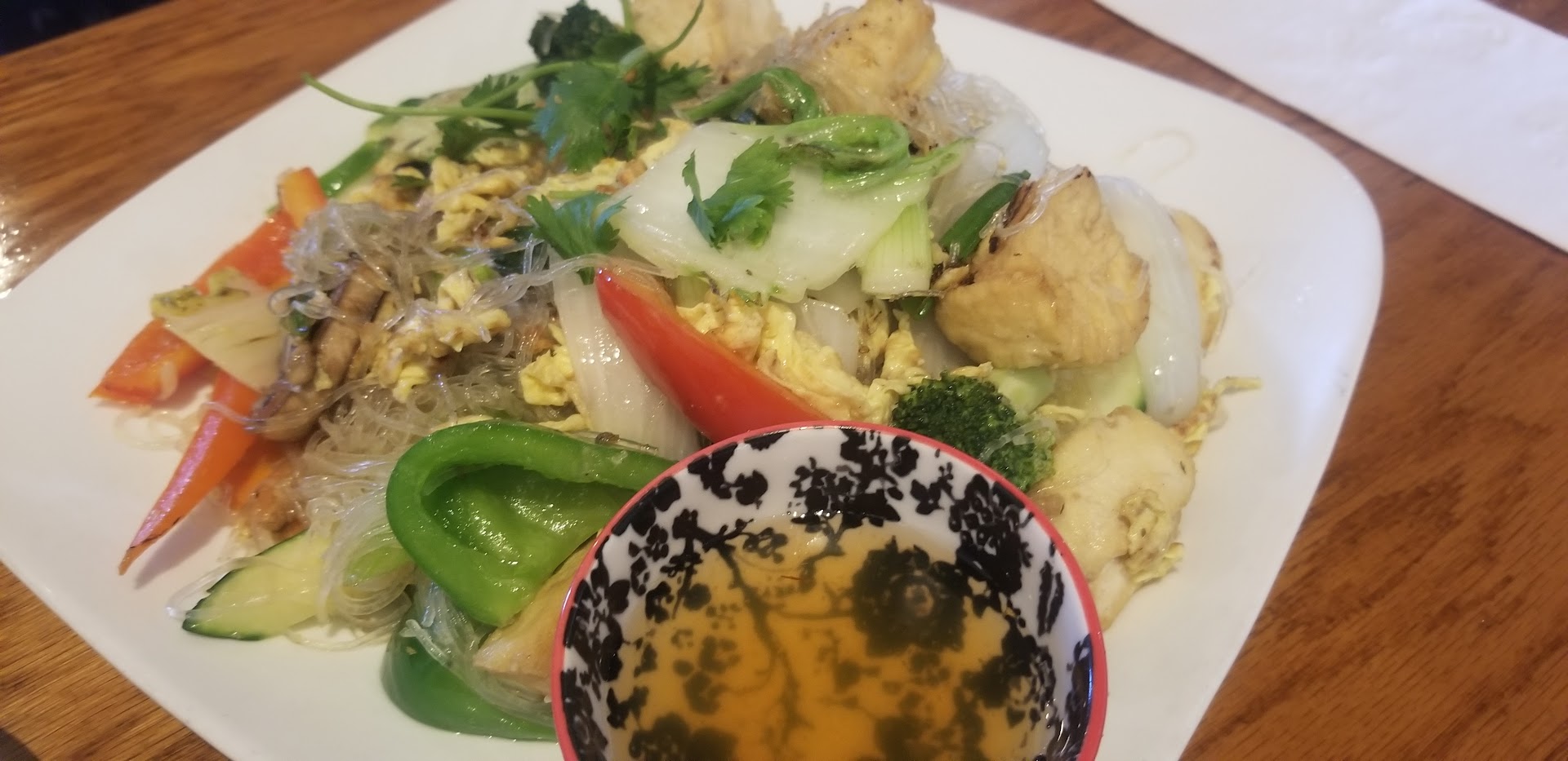 Read moreThe restaurant s tucked into a strip mall, which is not my ideal location for a restaurant, but the food is pretty good. I went with a large group and they were very accommodating. The service was top notch, and the food was good- not the best Thai I’ve had, but it was up there. The reason it gets 3 stars and not more, is the decor. If i am spending money to eat out, I want my experience to be amazing- I want a nice atmosphere, clean bathrooms, etc. They could use a serious redo of the inside. The tables and chairs are underwhelming, and I can’t even remember what was on the walls- just a couple things here and there. They have the place divided in two parts, and there is a small bar at the back of one section. The layout is awkward and it is not very inviting. The bathrooms leave a lot to be desired as well- they are cold and outdated. Again, the food was good, and I would prefer this place more as a take-out place. The staff was incredible, and our server could not have been nicer, also giving us separate checks for our group. The food was good- and if they redecorated or redesigned the interior, I would go back. For now, I only go when others want to go...