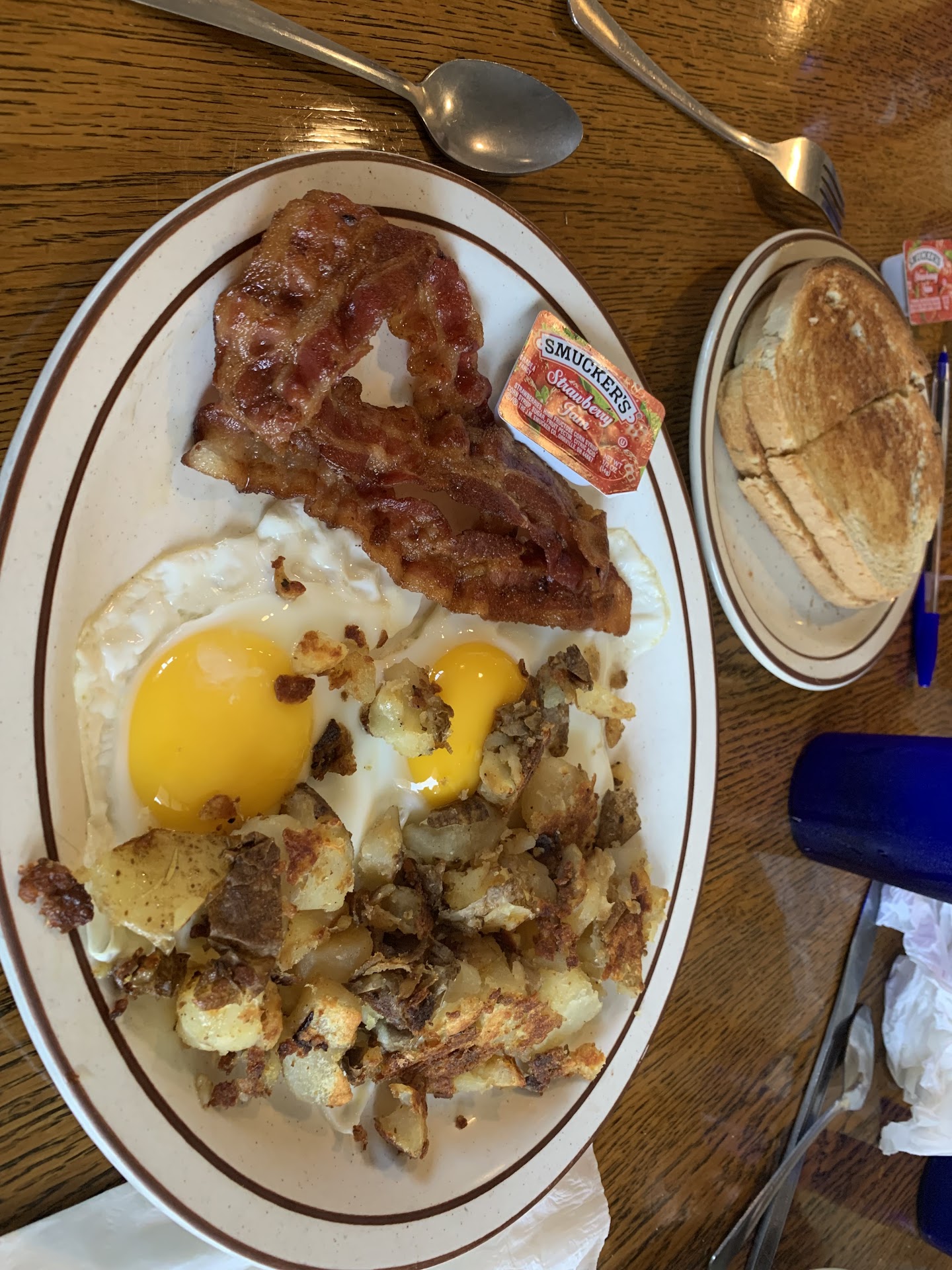 Obviously, one of the charms of the Plaka restaurant is its vintage decor and menu. It must be pointed out, however, that the menu has probably not been updated in a little while and offers side dishes like “homemade” corned beef hash. Unless “homemade” happens to be a brand name or their chefs are exceptionally skilled at making a product that closely mimics that which comes from a can, you may want to avoid that. Also, the “Aunt Jemima” brand name for syrup product was discontinued in mid-2021. Almost all foodstuffs have a “Best By Date” or “Sell By Date” that is generally indicative of an optimal range for using the product. Sadly, the Aunt Jemima brand syrup product we were served probably belongs on a collector’s shelf and not on the customer’s table. We also got a mild chuckle out of the well worn (and dated) labels on the other condiment bottles (none of which we used out of an abundance of caution). At that point we purposefully directed our attention away from the vintage aspects of the decor and ate our reasonably good (and hopefully not equally vintage) breakfasts.