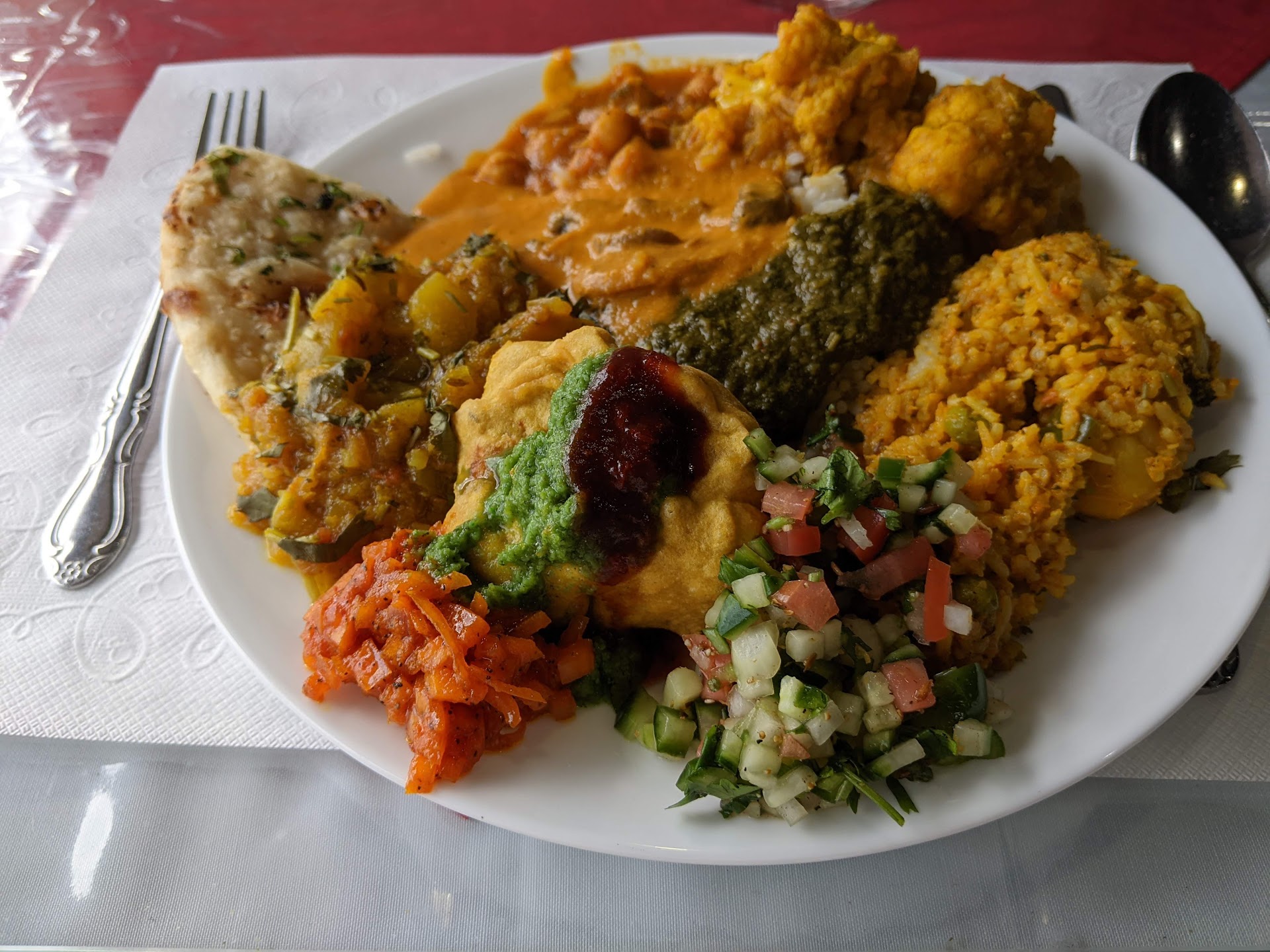 Spice is mild enough for my spice-averse mother but tasty enough for myself. Pakoras have a fabulous crisp if you arrive just when they open. Naan lacks the fluff and the Biryani is a little mushy but this food on the whole cannot be beat. There is a sign at the front of the buffet saying they will charge you if you waste food. My mother was not too fond of Indian food but has now become an enthusiast closing in on addiction. Parking becomes limited when the restaurant is full, about 8 spots outside.
