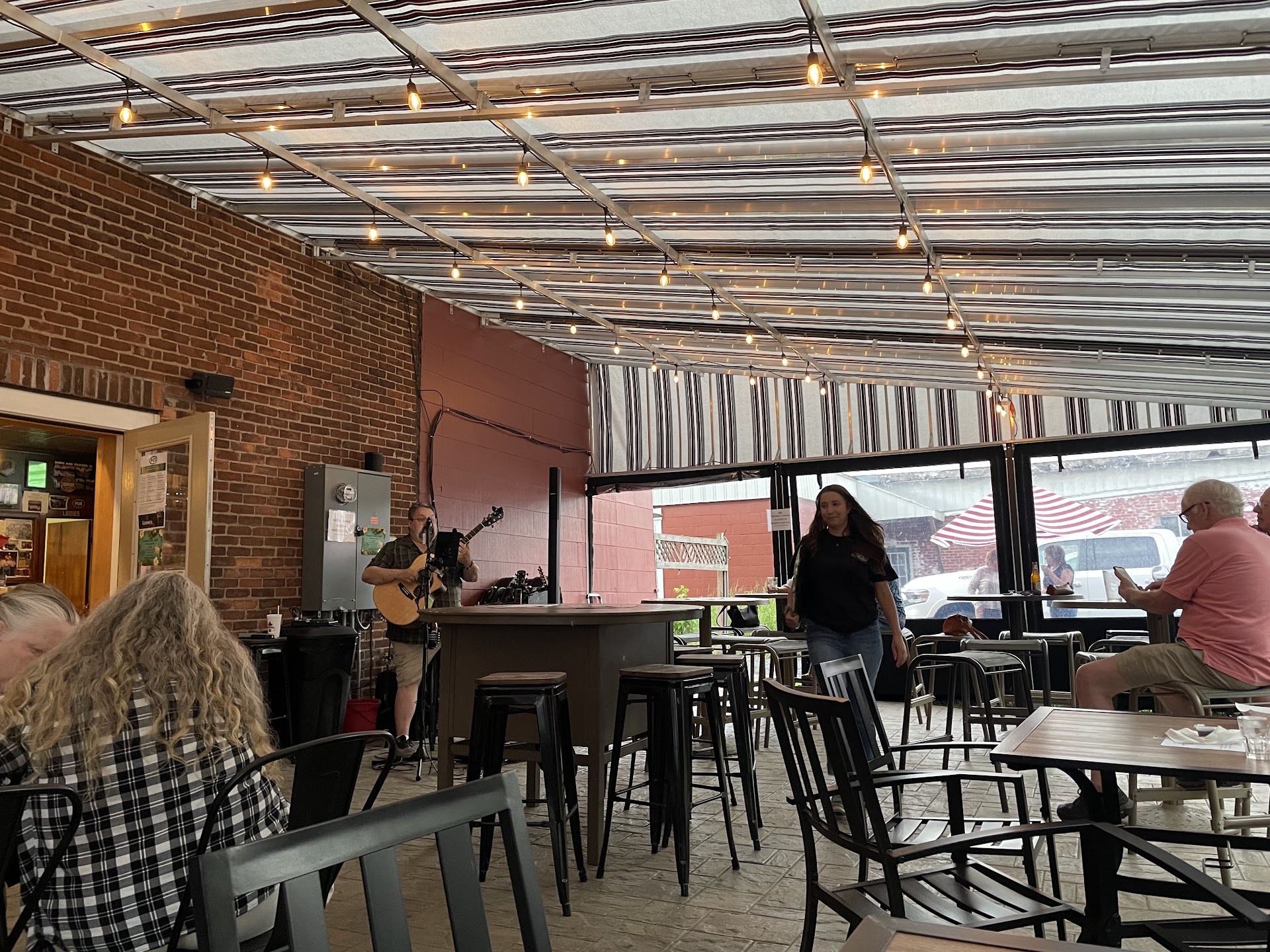 We were camping at Cranberry Lake and looking for a place with outdoor seating for dinner because we have an unvaccinated infant and our friends had a dog - we called ahead to P-2's pub and they said the dog was welcome (as long as she didn't dig holes - of course!). They didn't have high chairs, but we were traveling with one because we didn't know what dining options would be like, so that didn't bother us. Despite not having high chairs, the staff were super friendly and helpful with our unique situation. The outside patio is gorgeous and a really good option if the weather is iffy but you still want to eat outside because the ground is covered in pavers and the awning is very sturdy - this isn't a haphazard COVID pivot, but a real investment in the business. If the rain wasn't threatening we would have stayed for the live music! The two Wisconsinites in the group found their cheese curds authentic and the beer selection was small but respectable. Menu is small, but all you really need. Will definitely be back when we are in town...