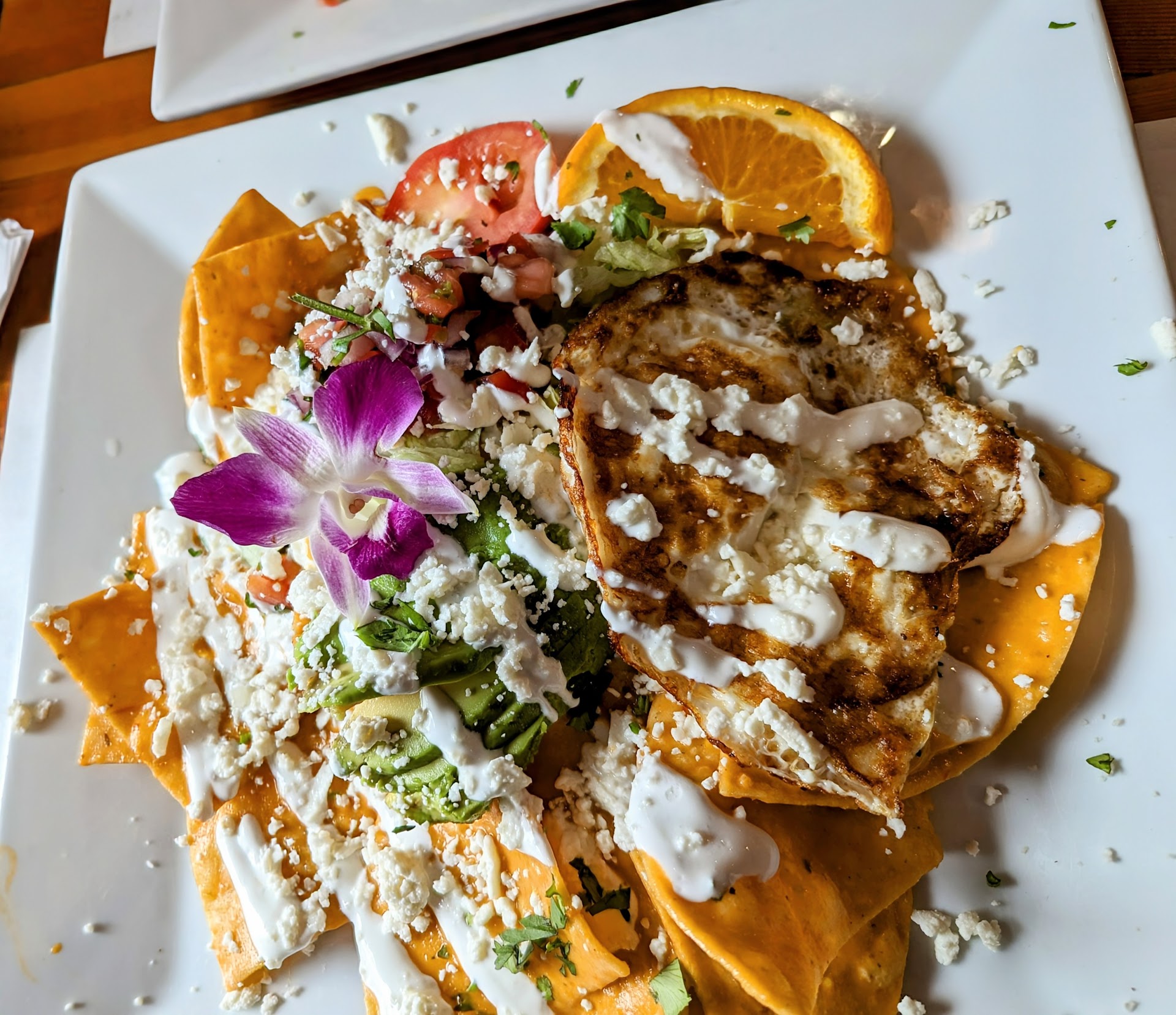 Bright and festive upon entry. I had decided on the Chilaquiles before we'd arrived as I had seen them prepared but never eaten them. Also, I was feeling Brunch-y and they are served with an egg. I was pleasantly surprised that the tortillas retained some crunch given that they are soaked in a sauce. The sauce seemed like a pureed salsa with maybe a little bit of cheese? It was supposed to be a green tomatillo sauce which I would have preferred. Nevertheless the toppings of avocado, egg, pico de gallo, and queso fresco were all fresh and tasty. Halfway through it occurred to me to add hot sauce and that ramped up the flavors. My companion had the Cobb Salad with grilled chicken. Even though it was white meat (obviously not our fav) it was tasty and moist. The avocado dressing was thin but tasty. We didn't have drinks and shouldn't have eaten the whole basket of tortilla chips and salsa while we waited. The aforementioned music was loud and the waiter had to ask us to repeat our meal selection. They did lower the volume after that. Ultimately a good experience and I...