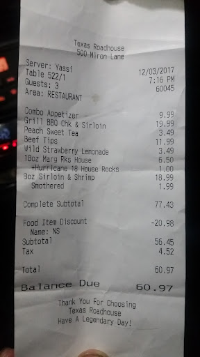 Read moreThe only thing I liked about my visit here was the waitress and waiters. I slipped on a rug/mat in the womans bathroom and hurt myself. I called the manager who told me he was the owner of this location and he was rude and didn't care I fell then I made a complaint and contacted texas roadhouse corperate relations and for months they dragged on a supposed investigation and I was advised by corperate not to contact a lawyer she would handle it( jaquoline) and she told me I should get to a emergency room to.get checked out so I did and The corperate office said that it was my fault !!!!!!! They won't even pay my hospital bill almost 5000 dollars now I'm in debt for . Texas roadhouse is the most judgemental sad company I have ever interacted with. T Jaquoline didn't know it was my daughter coming in and out of the bathroom way before me she said my daughter was obese in an email I have from her and she told me the day I made my complaint that the rug/mat should not have been where it was and corperate said an employee did a check every 20.mins that's a lie because the rug/mat was in same place never was moved until after I fell. I have never been treated so horrible they made me feel guilty and I am the one who.got hurt. I or my family will never eat there again . So sad and now I will be making more complaints to as many places in nys state that I can since texas roadhouse did this to.me its so.embarresing for me and my daughter have suffered pain from slip and fall and emotionally and mentally messed up because if how I...
