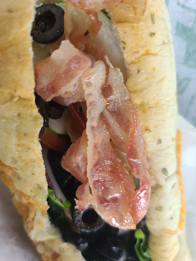 Worst subway experience ever, and I've been to Subways across the country for many years. I had to tell them to retoast the slimy pink bacon, and was explicitly told an aggressive NO when I wanted extra olives, and that he was only allowed to give me 6-8 olive slices on my footlong sub. He still didn't want to give me extra even if I paid extra but we eventually settled on an upcharge for extra olives, after he said this "isn't a buffet, mam". It clearly states in the subway rules that if the customer wants extra veggies, they get extra veggies(without an upcharge by the way)...what a strange and frustrating thing for him to be so passionate about, especially since i would have been happy to pay if he just said that instead of NO absolutely not. He was beyond rude, and threw my sandwich together haphazardly after the olive conversation without giving me a chance to add any other toppings...and was mean to his employee while he was at it. Nasty horrible service, the eating space is very small, dated and could...