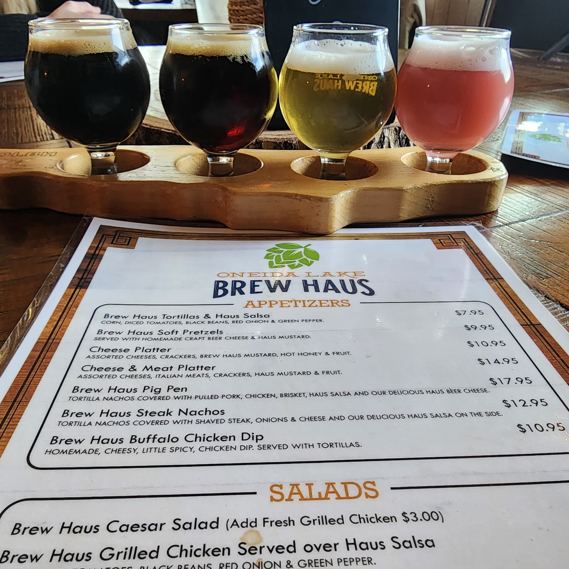 We just got back from a delightful lunch and had to jump into a review! We’re staying at a local Air B&B and Brew Haus was in walking distance. It’s a snowy Saturday in March, so the restaurant was quiet. The hostess/bartender, Erin, warmly greeted us, and told us we could sit anywhere we wanted. We had the dining room to ourselves and chose one of the round tables in the corner. The outside of the building in no way prepares you for the rustic, but charming atmosphere inside. The fireplace was going, there are what appear to be hand painted murals on the wall and we were given the choice of sports events to watch on the large tv above the fireplace. There is an extensive draft beverage menu that offers flights, which my group enthusiastically chose from with some guidance and recommendations from Erin. No one was disappointed. Next came appetizers. We started with the Haus salsa (so good we got some to take back with us) and the soft pretzels (also good). For lunch we went with burgers, the grilled chicken (exceptional), pulled pork (one of the best I’ve had) with Mac and Cheese, and the shaved steak (scrumptious ). Between the service and the food and drinks, we had a truly enjoyable meal. Don’t miss this gem if you’re in the area! A bonus is that one of our group has Celiac’s and is gluten free.Not only was Erin knowledgeable about gf, but many of the menu items were gluten...