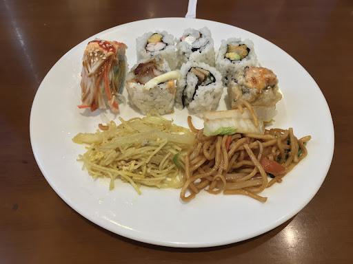 They have a big variety of (very Americanized) east Asian food and some country-style American food. For buffet food it's pretty good. The food mostly tastes relatively fresh, save for a few items (seaweed salad, mushroom salad, glazed banana) that tasted like they'd been sitting for a while, but nothing was bad. I tend to avoid the fruit bar, though - it seems like most of the fruit comes out of a can, and the pudding is pretty bland. Their basic sushi can be a little underwhelming, but the more complex rolls are good, and honestly all are better sushi than I'd expect from a buffet. From this visit, the dishes that I really enjoyed were the flounder with crab meat, shrimp cocktail, Japanese-style tofu, and egg custard. The staff is nice and they're very attentive with refilling drinks and taking away plates that you're done with. Some of them don't seem to speak English super well which might present a little bit of a language barrier, but nothing serious - someone I was with tried to order a drink that they didn't have and confused our waitress who didn't know what he was saying, but she called over another waitress who could understand and they sorted it out. I saw a few bowls with scrapes of food still in the corners at the buffet, and while the overall cleanliness of the place (besides the bowls) this time was okay, I've seen it looking a little dingy before. The interior design of the place is very cool - they've got a waterfall into a small koi pond, pagoda-like canopies over the salad station, a lighted floor in places, and the ceiling is painted to look like the sky. There are some elements of it that are very strange to me, though, like the glass (or plastic?) dividers that are filled with what looked like just crumpled paper, and the fish tank with absolutely nothing in it besides fish, not even pebbles in the bottom - it looked clean, but are you really supposed to keep fish in a bare tank like that? I also wish they'd do a better job of labelling the food at the buffet. Most items are labelled correctly, but there were a few with no labels or that were mixed up, or just confusing to figure out which label corresponded to which item. Anyone with any sort of dietary restriction can tell you what a headache it is to...