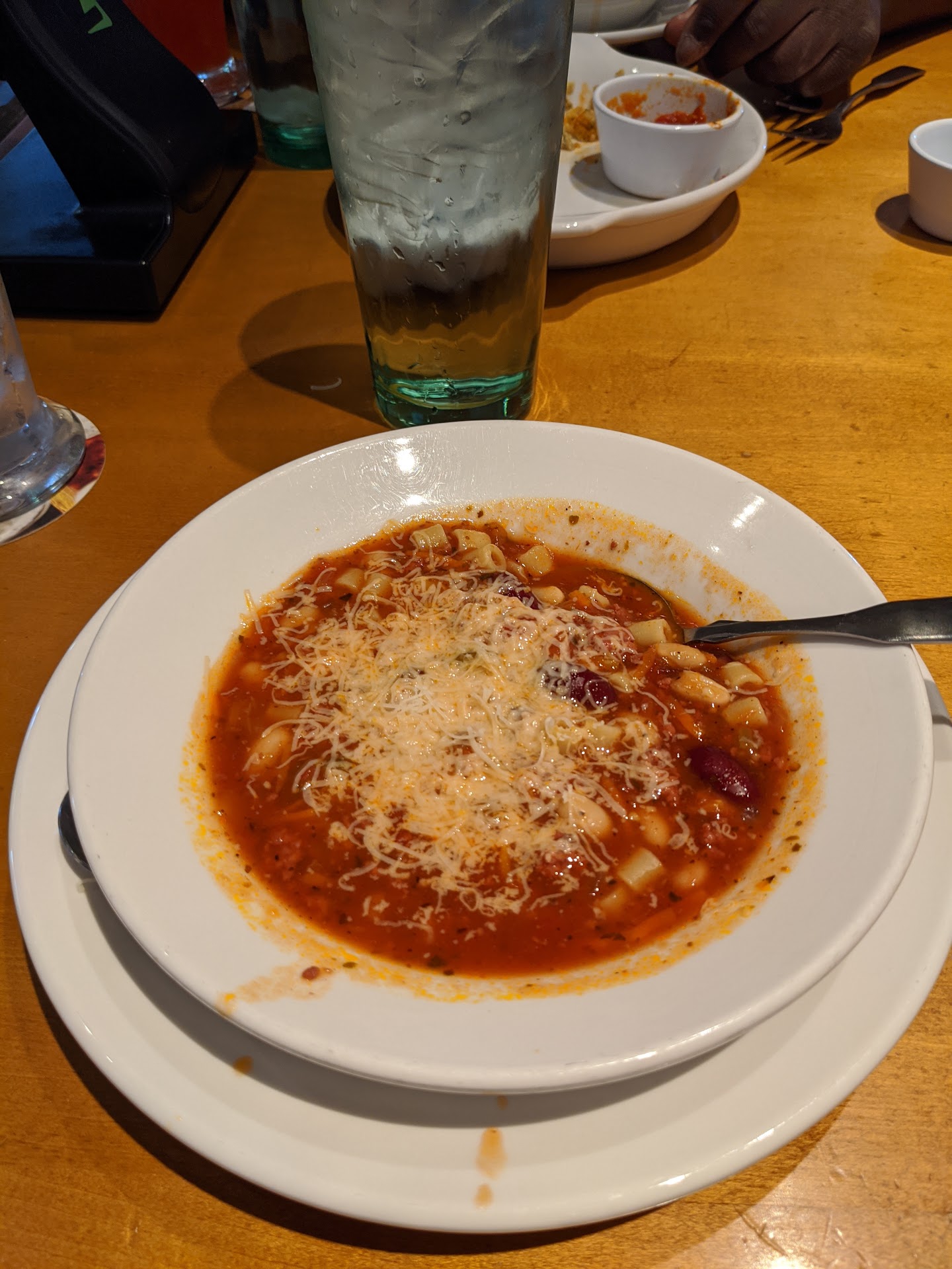 The salad, soup and bread sticks arrived right away. My family member didn't enjoy the soup so I decided to have their order and they had mine.