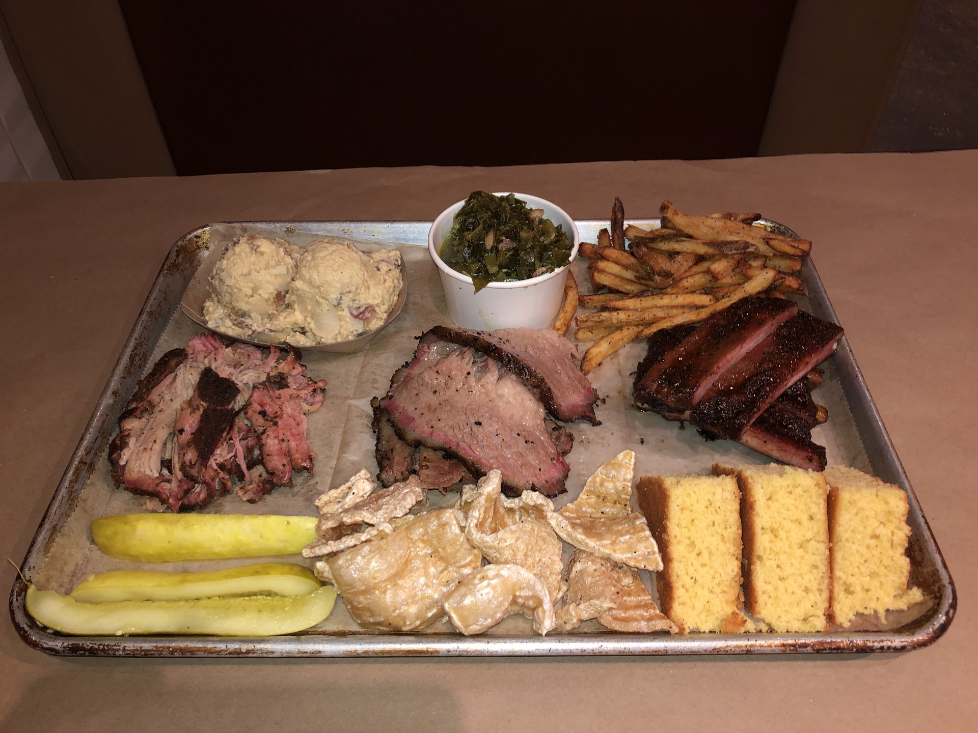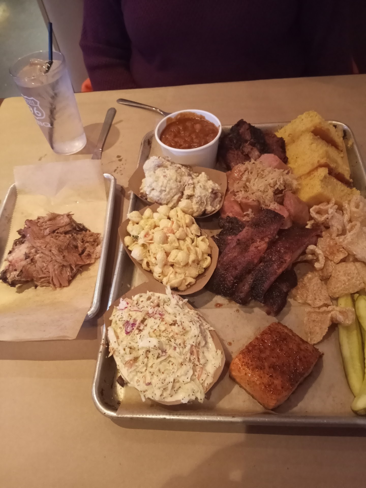 As far as the food goes, it was a splendid experiance. All of the food we got was delicious. So much so that i certainly over ate but it was so worth it. Perhaps people may not like that they currently only have 1 sauce butt i can tell you its really good. The brisket is amazing and a must get. The ribs were also fall off the bone tasty. The side were equally as good as the main course. I personally thought that the beans were better re-heated the next day and you should make sure that your mean comes with the cornbread which is also fantastic. I can't rate the food here high enough. You really need to go try it...