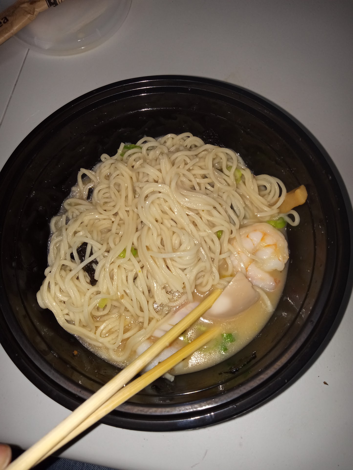 The soup broth and the jumbo shrimp were bland. The soup tasted expired and bitter. The shrimp tasted like they just threw it in...