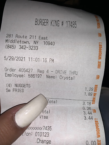 Read moreThe employees here are extraordinary. On New Years eve I took a drive out with the family and decided to stop at this burger King on Rt. 211 we ordered an ultimate pack but one of the wapper/cheese burger was missing. Which wasn't a problem I do understand mistakes due to busyness do happens. We enjoy the taste of that meal my kids was asking for more so we decided to do another pickup of the very same order and said as we are there we probably can make it known about the missing item in our previous order. The service we received was one that wasn't expected the drive thru associate couldn't handle that part of it so the manager (of a Caribbean accent) was brought into the picture. From the manager to the sales associates were so polite and so friendly it made me feel valued and not embarrassed to bring up something that happened few days ago without any proof provided. I WILL SURE BE ORDERING BK FOR MY ALL MY EMPLOYEES WHEN I MAKE LUNCH ORDERS.....See...
