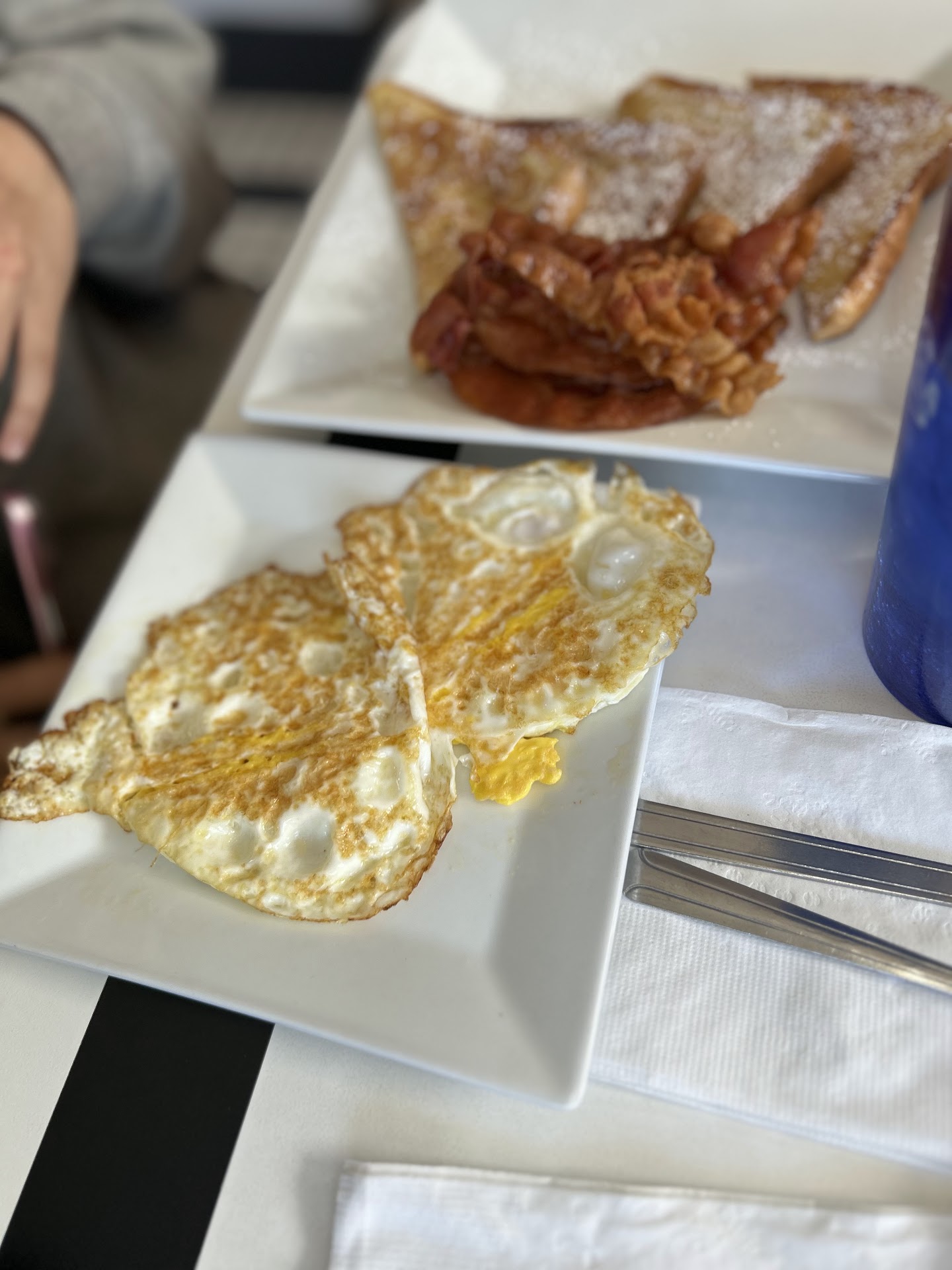 As for the food, the chicken and waffles were a bit underwhelming. It tasted more like a frozen chicken tender with a dusting of powdered sugar, which was a bit of a letdown. On the other hand, the steak and home fries were decent, though we did need to add a bit of salt and pepper to bring out the flavor. I was hoping for the home fries to be more on the crispy side, but they ended up a little soggy instead.