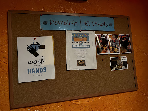 -One 4lb El Diablo burrito stuffed with their choice of chicken, steak, or pork -One half pound each of house slaw as well ad refried beans -One ghost pepper chile infused brownie Successful completion earns you a free meal, spot on the wall of fame, and everlasting glory. Failure brings forth a 30 dollar bill and residency on the wall of SHAME.