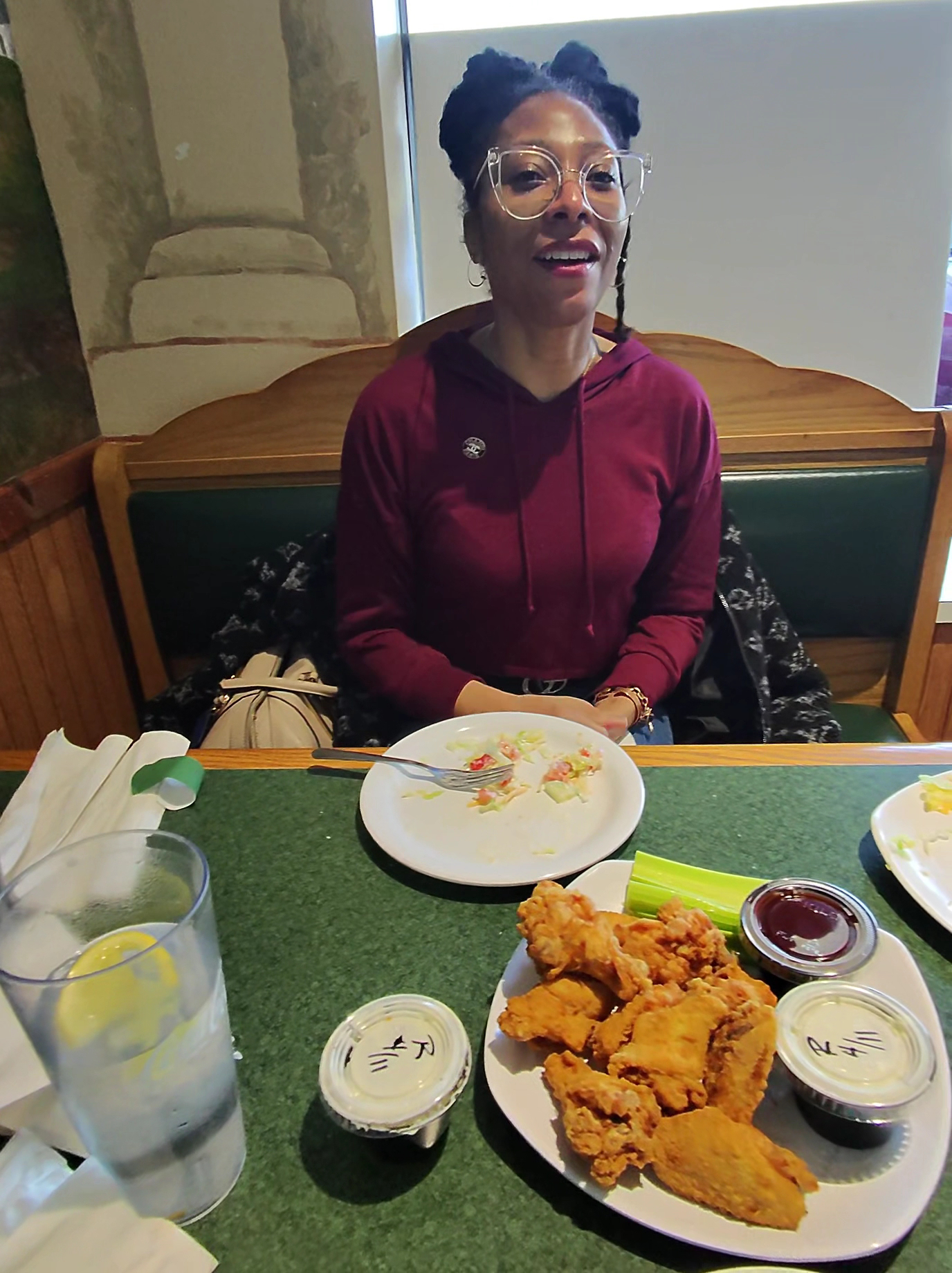 Gave her another chance until she didn’t check on us the entire time, no refills or check ins even after walking past us more than once, only asked us if we needed anything after we were done with our food but by then we already wanted to leave. Wouldn’t recommend Brittany (our server) but would recommend the server with the purple hair, she seemed nice...