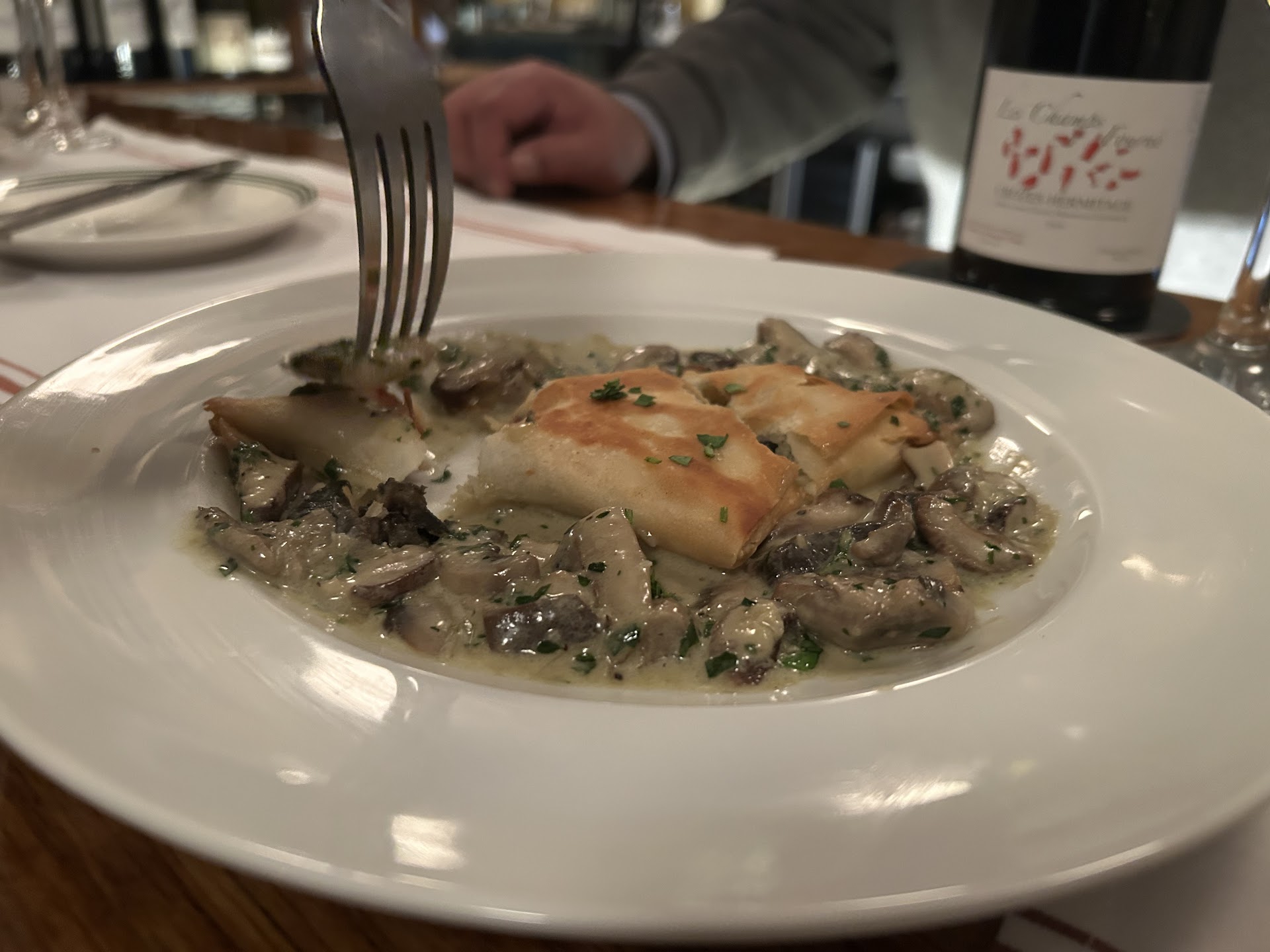 The restaurant is very quaint and elegant. It has that Bistro appeal with soft music and dim lighting. You are greeted at the door and sat. Served with bagettes and pâté. We order from his very nice elegant assortment of wines. A Red Blend from Portagul.