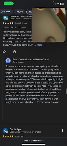 Ā Ā Ā Read moreI visited Bellaās for the first time this weekend with a large party that was reserved a week ahead of time. We waited 20+ minutes for drink orders, and waited nearly an hour before our dinner order was taken. Water bottles never got refilled until after dinner order was taken, even though we asked for more water when our drink orders were taken. One of the sodas that we ordered arrived and tasted like spearmint.. quite odd for a glass of Pepsi to taste and smell like a pack of gum unless the glass wasnāt cleaned properly. Food arrived after about an hour and a half to 2 hours after we had arrived, and at least 50% of our party was unhappy with the meals. My cousin & I both ordered the taste of Texas combo Medium & both tenderloins were cooked Rare, as well as arriving to our table cold. Pasta looked like something I could order at a local diner for half the price, and the prime rib was more fat than meat. Honestly, Iād expect more than 1 server for a party of 20 on a Saturday that was reserved a week ahead of time. Iād also expect a much more attentive server / bussers for a table thatās easily a $500+ tab. Iāve been a server before for multiple years, and Iāve been in that servers situation where youāre serving a party of 20 & serving multiple other tables at the same time.. Not an easy situation to handle, and it certainly wasnāt the servers fault. Management clearly didnāt handle this situation correctly and needs to have more of a presence in the front of house, especially charging the prices that they are. I also entirely agree with the previous reviewer commenting about the host stand being placed directly in front of the entrance⦠Kind of odd to have to stand there holding a door open waiting for a party to be seated because thereās no possible way to squeak around a party of 6 talking to the host right in front of the only entrance..