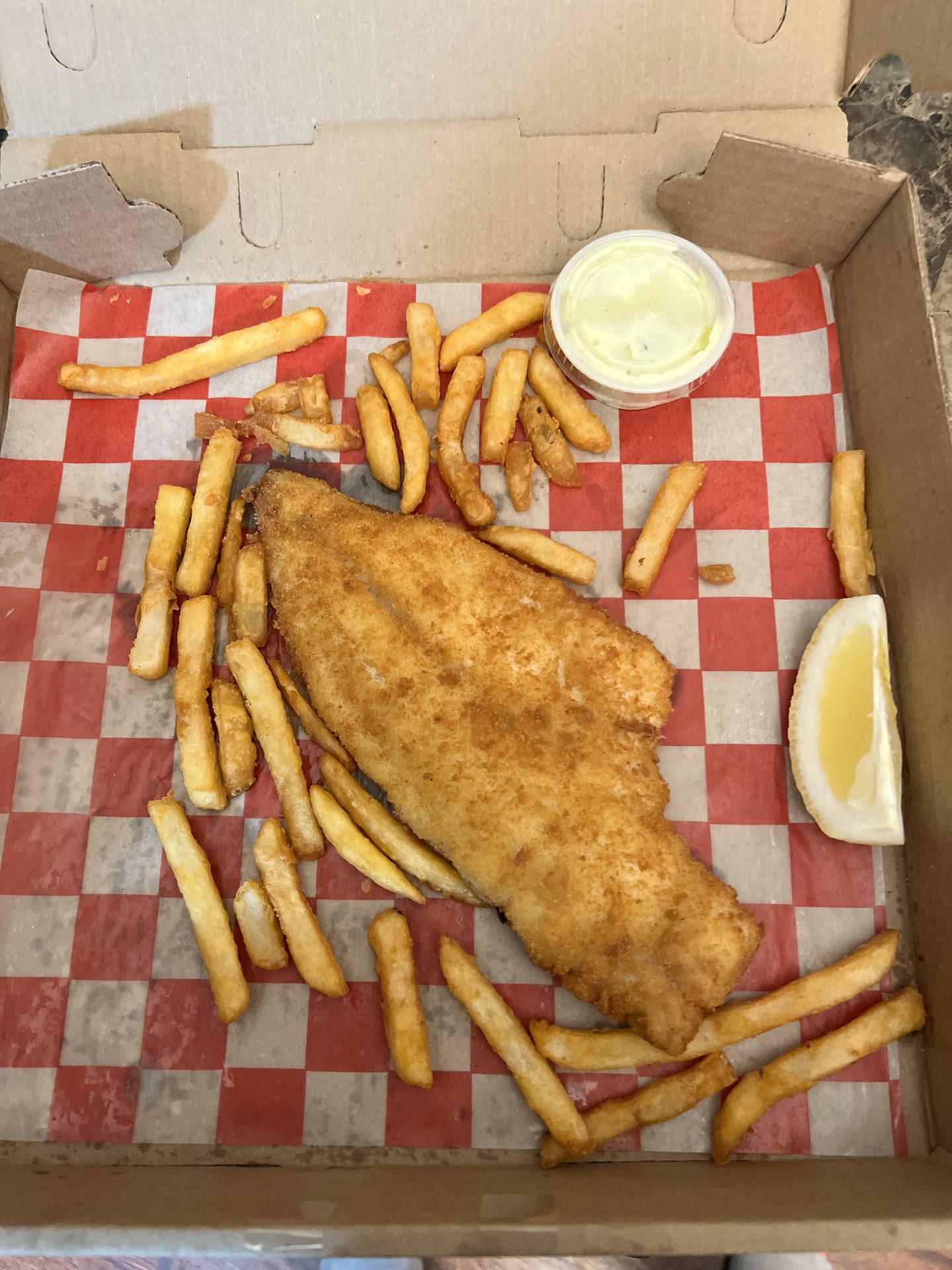 Read moreVery disappointed all the way around. Ordered our food online, not our first time, at 7pm. Our food was supposed to be ready at 8:00pm. I patiently waited inside for another half hour. We ordered 2 kid’s meals, 2 entrees and one side order of bam bam shrimp, over $65. The picture attached is my husbands $16+ fish dinner. I am speechless. Where are the fries? And you only get one side with this meal. In the past we realized they aren’t the most generous with portions but this is completely unacceptable. And who has the time and energy to go back? We won’t be returning here ever again. Bar tender was very nice but it doesn’t make up for all the up charges and then this tiny portion. ...