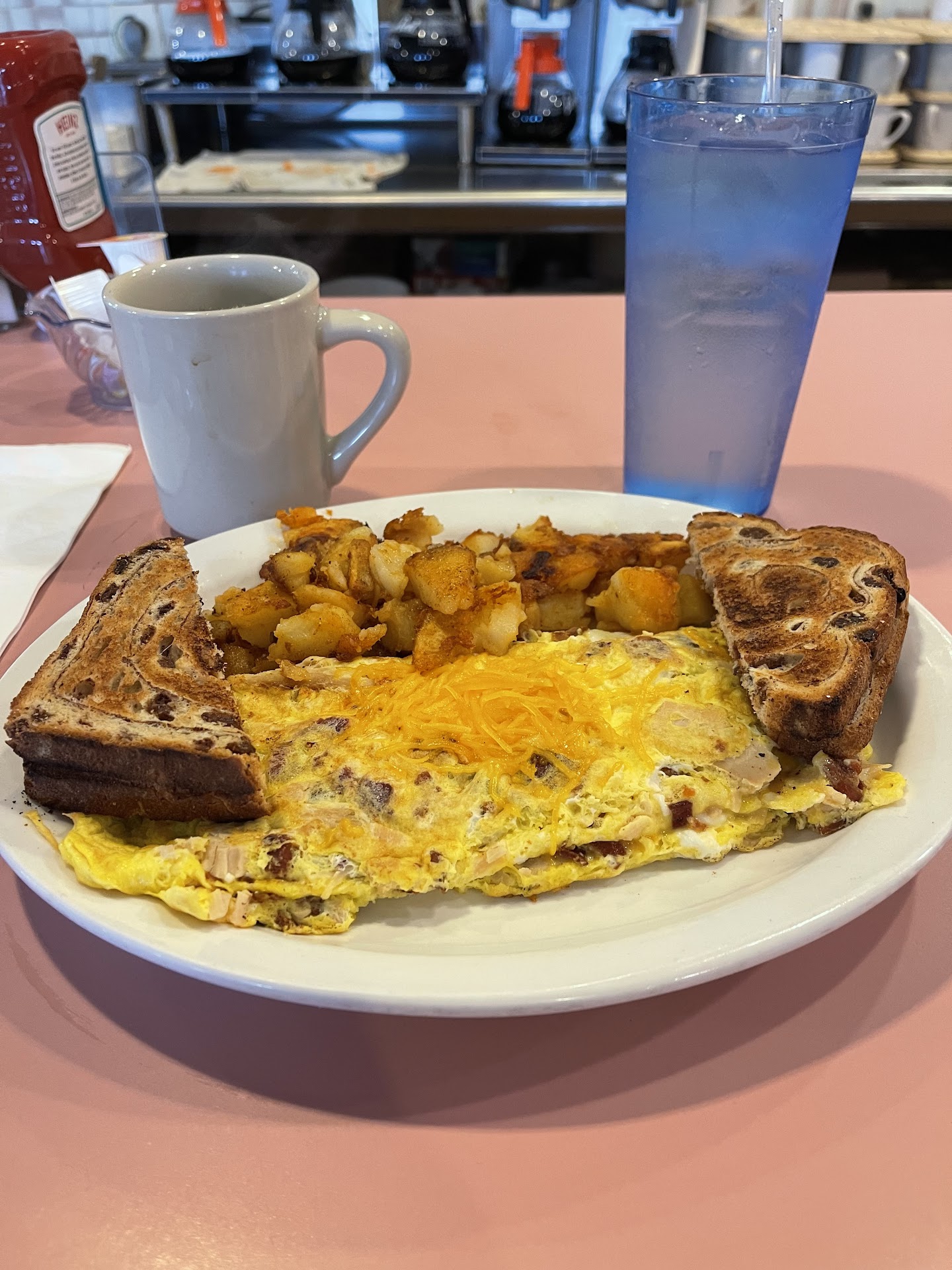 Omelets here are amazing. I usually share meatlovers and cheese. There is always a lot of meat and cheese, and I have no idea how they close it because it just seems like so much food.