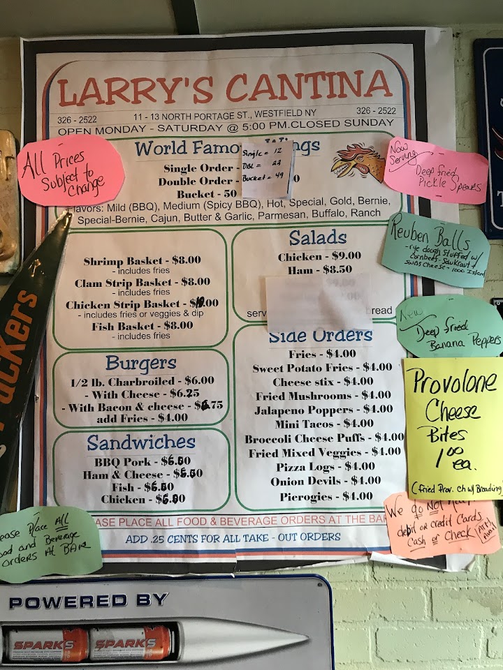 Ā Ā Ā Read moreLarry's is a pillar of the community in Westfield! No frills, Cash only (there's an ATM just inside the door), simple but excellent bar food that comes out hot and fast! Their wings are incredible - I recommend the "Bernie's Special Sauce" On any given night there can be 2 - 40 people. There's the bar to the right that seats about 10, maybe 12? Then a bunch of tables/hightops/standing shelves. Bartenders are quick, nice, no-nonsense. No fancy cocktails here, basic brews, spirits, and great food! Light bar fare, burgers/wings/fried apps maybe a fish sandwich here and there. If you like wings and hometown bars, stop in for an hour and take in the scene. Only...
