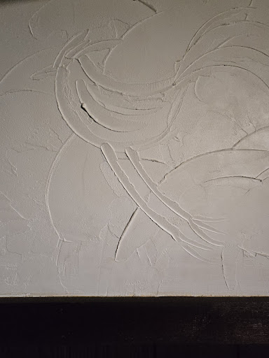 Overstuffed, over satisfied, and over the moon, we began to consider heading home. But first, our hostess, Joann Randall, who should really should be called The Docent, showed me various points of interest back in the bar. There was a huge display of original owner, Herb Feil's, Packers memorabilia, a corner nook showcasing the Feil's one millionth loaf of bread with a wrapper from the original bakery in Germany! Over the hostess stand is a beautiful German cuckoo clock, purchased by Herb Feil's son and current owner, Terry Feil, and his wife on their latest trip to Germany. It is stunning! Joann also pointed out neat little designs worked into the plaster by the artisan plaster worker, who told Herb that he was bored and, consequently, plastered chicken motifs throughout the restaurant! Supposedly, there are thirteen of them, but I only found two.