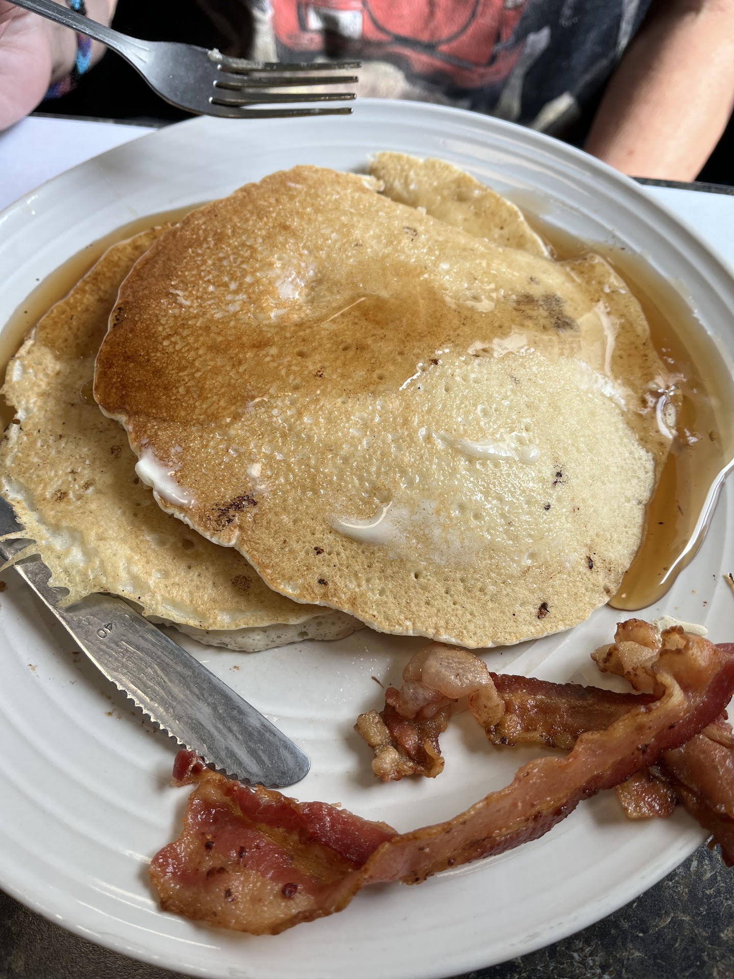 We were camping when a huge thunderstorm decided to hit the area. Thunder, lightening, hail, the works basically making it so we couldn’t cook anything. So we searched for a diner and found Kylie’s. Dinner was good (had us coming back the next day before we left) but guys breakfast was phenomenal. I love pancakes. Love them and these were so fluffy! Everything was reasonably priced and the cow decorations were just cute. When I’m back in the area I plan on making a stop again. Service was great to super friendly...