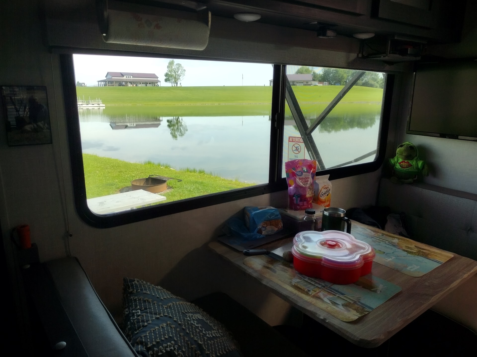 Read moreIt was our first time there. I definitely liked the atmosphere of the place, It catches the eye. Also the view of the campsites around the lake with the campfires going was a pleasent site saw. It was busy when we got there so there was quite a wait for our food but nothing horribly bad. Our server was polite and did check on us frequently. I ordered the scenic view burger (medium) w fries. My other half ordered the chicken cordon blue balls and sweet potato fries. The wait wasnt bad but the way the food came out was one of the few flaws. Instead of all at once my gfs whole order came out first. My burger came out about 5 mins later followed by my fries 5 mins after that. As for my burger it was well done and one of my gf's cordon bites was hollow. All in all that didnt ruin the experience because the food was still flavorful and well prepared. Will indeed go back in the future and I definitely recommend stopping there if you havent...