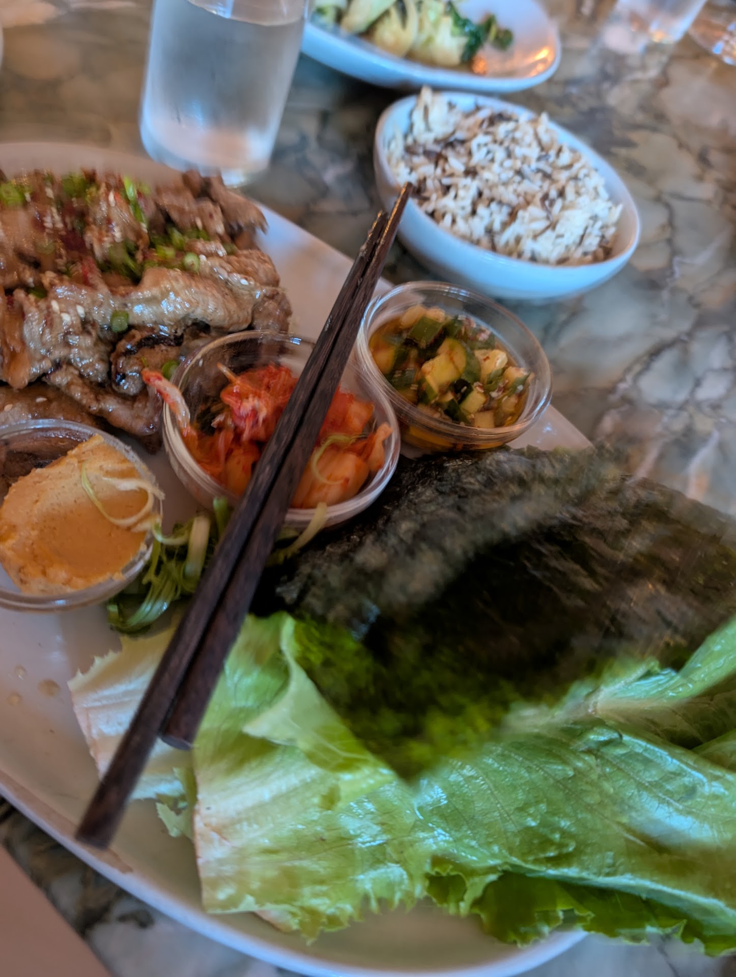 The chickpea tofu was great! The bibimbap was great! My friends said the shrimp and shishito peppers and the croquettes were great. I don't know what else they ate but the birthday banana ice cream with caramel and crispy rice was also great.