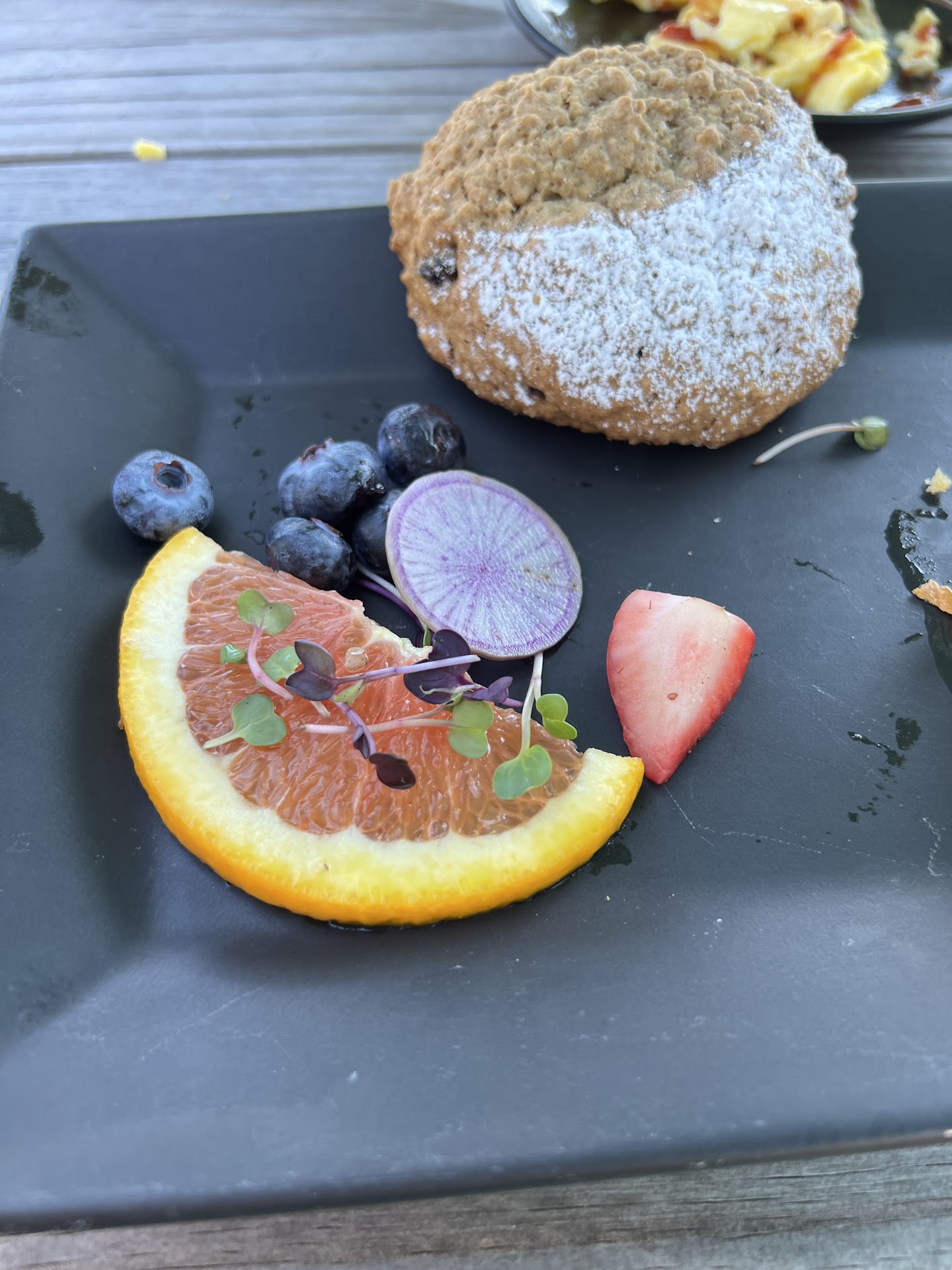 Ā Ā Ā Read moreWent here after hearing good things⦠Iāll start by saying the atmosphere is really cute, it was way too warm inside so we decided to sit outside since it was a cool day. The outside area is nice but they definitely need to get umbrella stands as the umbrella through the center of the picnic table kept falling over and almost hitting us. The server actually saw the umbrella fall and asked one of the other staff members to come out and push the end of it into the ground to prevent it from falling again but that is a temporary fix. The ham, egg and cheese sandwich was good but it was said to be served with a side of fruit. Iām attaching a picture of the āsideā of fruit given, it was more like an accent on the plate because it was 5 blueberries, one sliver of an orange and one sliver of a piece of strawberry. The picture of the fruit is when the fruit wasnāt even touched yet, thatās how they served it to me. The prices are way overpriced and Iām used to spending money at fancy cafes and have accepted that prices have gone up but $12 for a small breakfast sandwich that doesnāt even come with a proper side is pricey. It should be around $7/8. There other menu items were pricey too, $5 for a bagel, $16 for an avocado egg sandwich, $6 for a side of two scrambled eggs for my toddler, etc. I spent $30 on one cookie, one latte, a side of eggs, one small breakfast sandwich. The oatmeal raisin cookie was way too sweet and I wouldnāt get it again. The coffee was good but small, the latte I got was one size. Overall I would say I would only go back...
