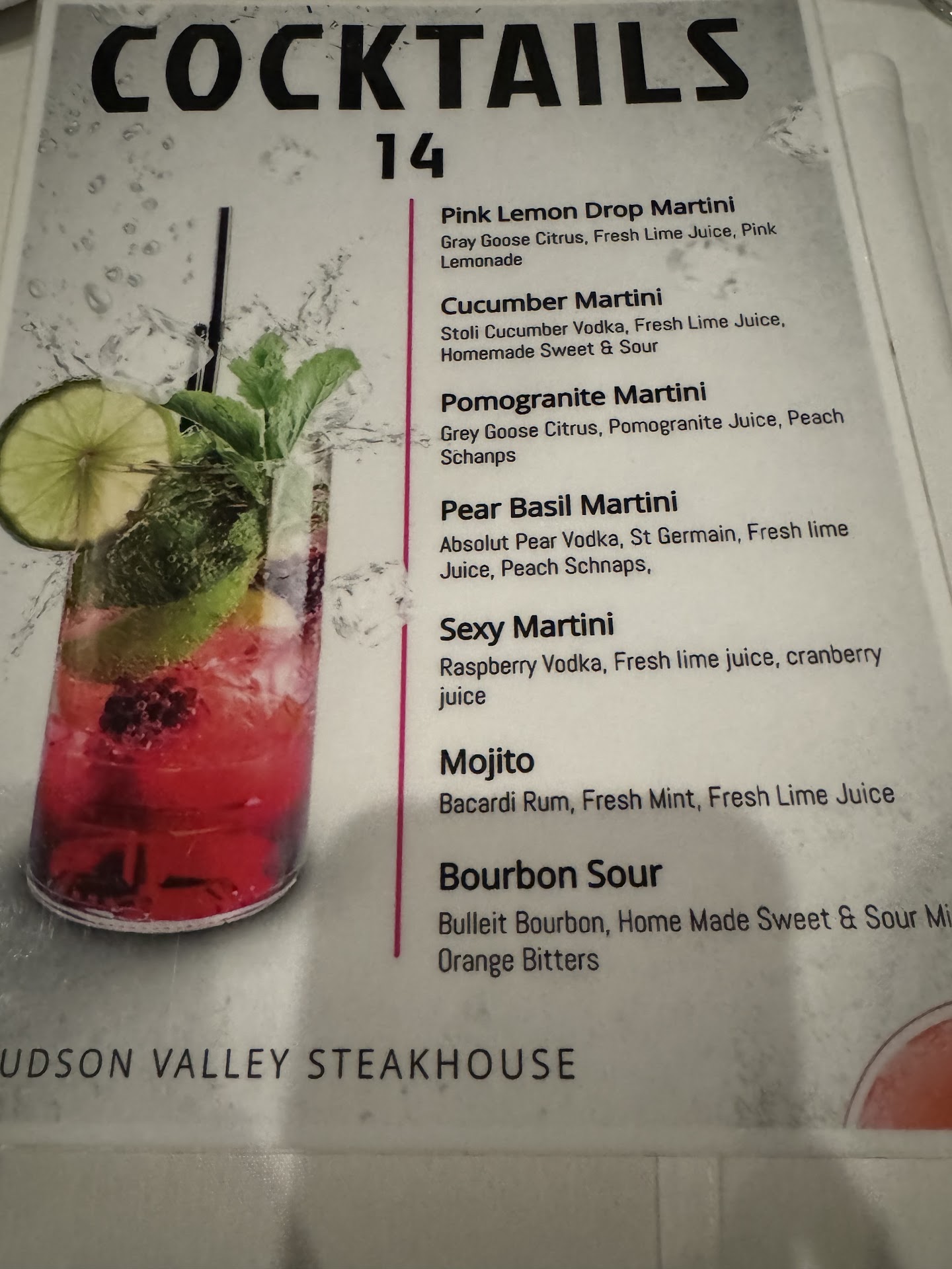 For dinner I ordered the surf and turf which included a petite filet and a lobster tail. Both were cooked and seasoned perfectly. My husband ordered the chicken martini which was also very good. This leads to my second and third issue for not giving 5 stars. I can get charging the high prices for the beef because it is supposed to be high quality, and mine was delicious so I’m sure it was. But if you’re going to charge such high amounts for a dish like chicken, you need to either have bigger portions or for it to be organic to justify the price. So if it’s going to be organic, or have a sauce, or be USDA Prime, they should note that on the menu, but nothing on the menu has descriptions. If I hadn’t looked it up on their website, I would not have known why they were charging so much.