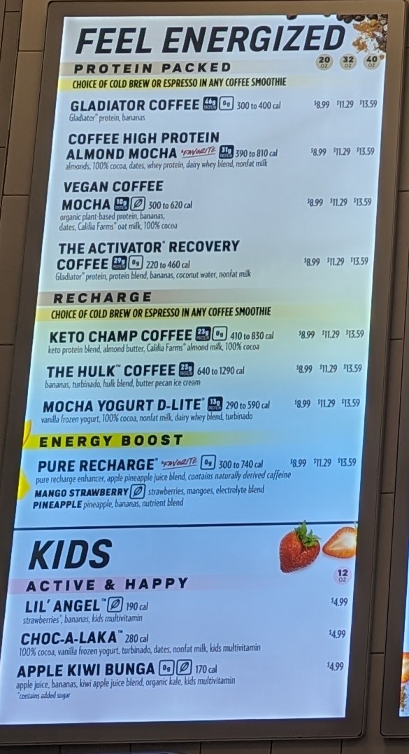 Read moreI know this place just opened recently, but things seem to be running very poorly. Aside from the bathroom feeling like they werenât properly cleaned, things felt a bit neglected. On top of that, I saw two young children walking behind the line with the other workers. I thought they wandered in there, but their mom was the manager of the store. When I actually did order my smoothie, I noticed the blenders werenât properly sanitized. This is a big deal for me because both my son and husband have peanut allergies. I do my best to scope out any issues before I bring them in because if thereâs any form of cross-contamination, we have to rush to the ER.