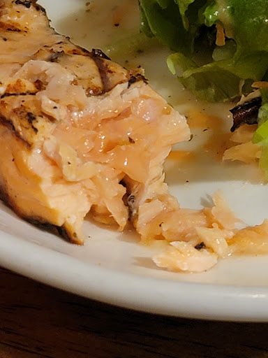 Halfway through our salads, our waitress did apologize about it and took off. We finally got the salmon and cooked chicken. I realized that they blackened the salmon instead of grilling it, but I was hungry and didn't care. Neither the chicken nor the salmon had any flavor. So we both reached for the salt grinder. We laughed because that type of salt stays crunchy on your food, so now it's flavorless and textorized. Unfortunately, my salmon was also raw in the middle as well. My husband finished his salad reluctantly, and I left what was left of the fish on the plate.