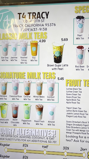 Read moreThis is a very special bubble tea shop. In California, there are all kinds of bubble tea places, but T4 has always been a little food hub. We noticed some new snacks here that we didn’t see at another T4 location a few years ago. You can adjust the sweetness level and add various toppings. We ordered an egg waffle and added ice cream to make the flavor even better. We also noticed other customers ordering fries with a unique Taiwanese seasoning and sauce, which made it even more flavorful. Highly recommended! There are plenty of seats, and the restroom is clean. The location is in Tracy’s Old Town on the main street, next to a bank and coffee shop. The parking can be a bit challenging, so be prepared for that. The staff is very friendly, and the...