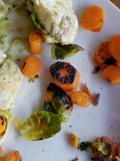 My chicken got the chimichurri and his steak got the salsa verde, which wasn't even green, it was red. So we had to ask. We agreed to keep the dishes the way they were because it would have taken too much time to have them switch. And upon my first bite of chicken, it was cold. Not room temperature but cold. And my carrots and brussel sprouts were burnt. I don't mind a little char on my veggies but these were burnt.