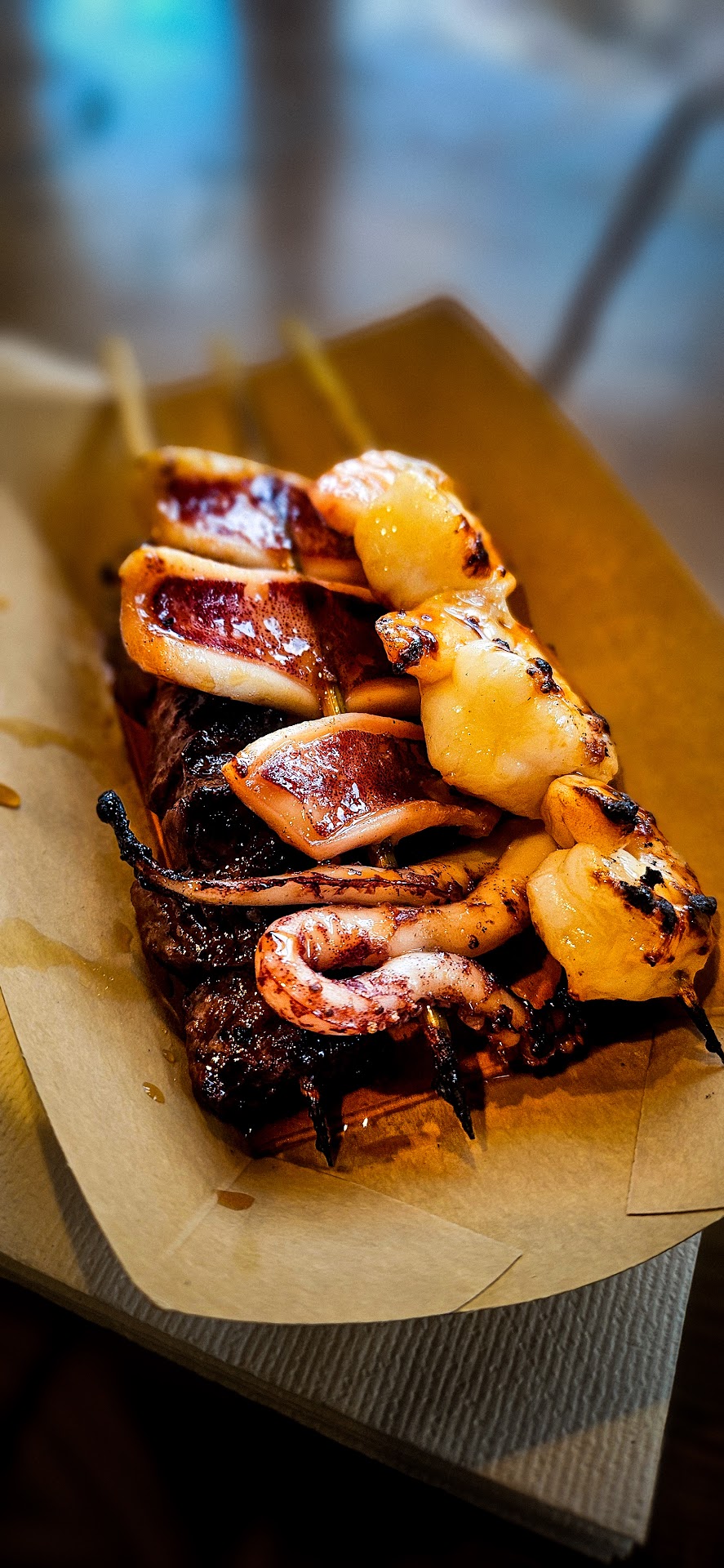 The seasoning, preparation, sauce, and flavor are exceptional. The meat on my skewer was well rested, perfectly cooked, and delicious. I haven't had squid as good as this in the upstate. The shrimp was also light, flavorful, and cooked perfectly.